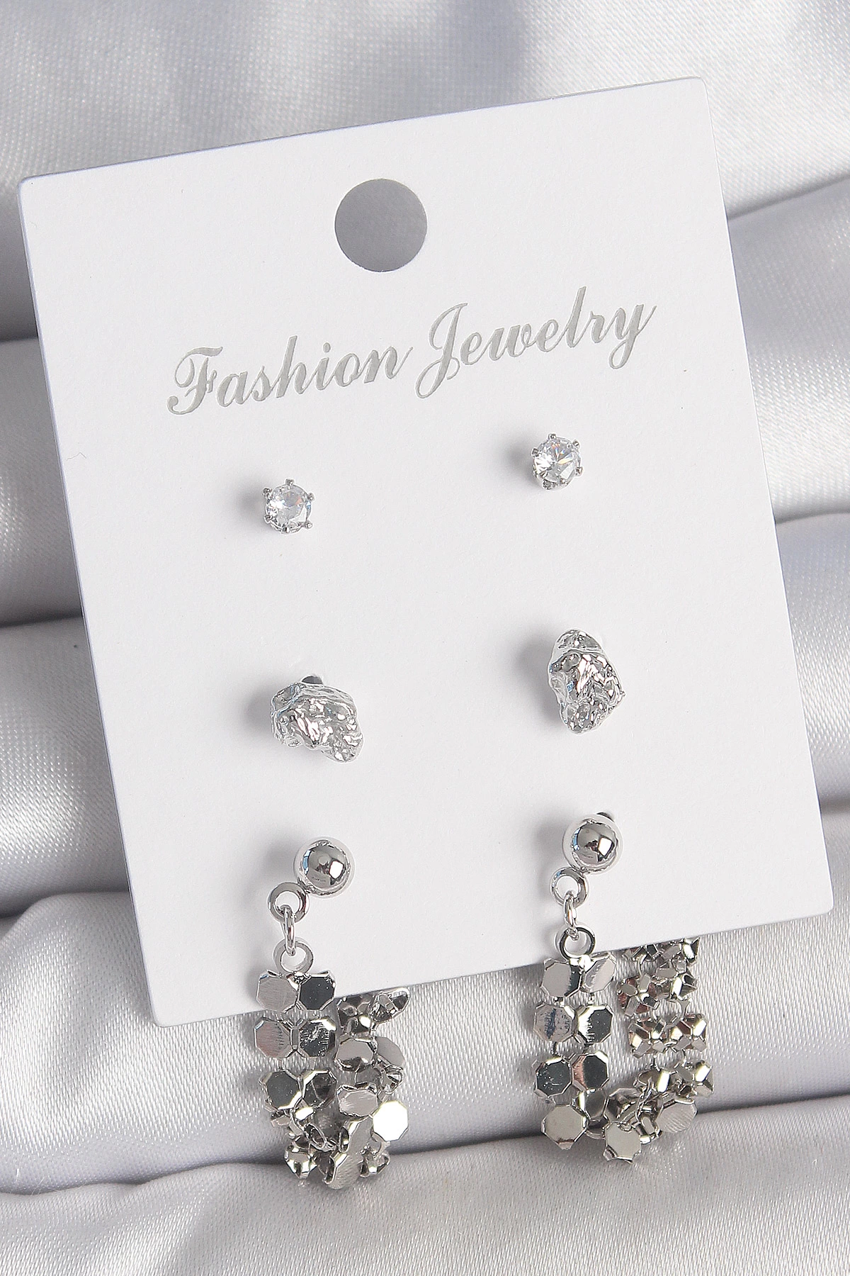 Pirinç Gümüş Renk Zirkon Taşlı Pullu Sallantılı Model 3 Çift Kadın Küpe Seti