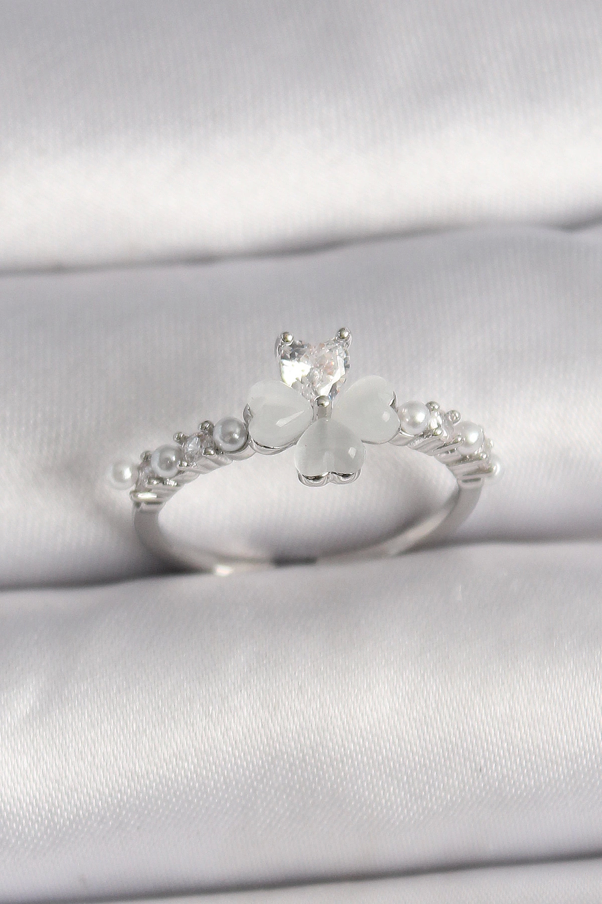 Pirinç Gümüş Renk Zirkon Taşlı Yonca Model İnci Detay Ayarlanabilir Yüzük