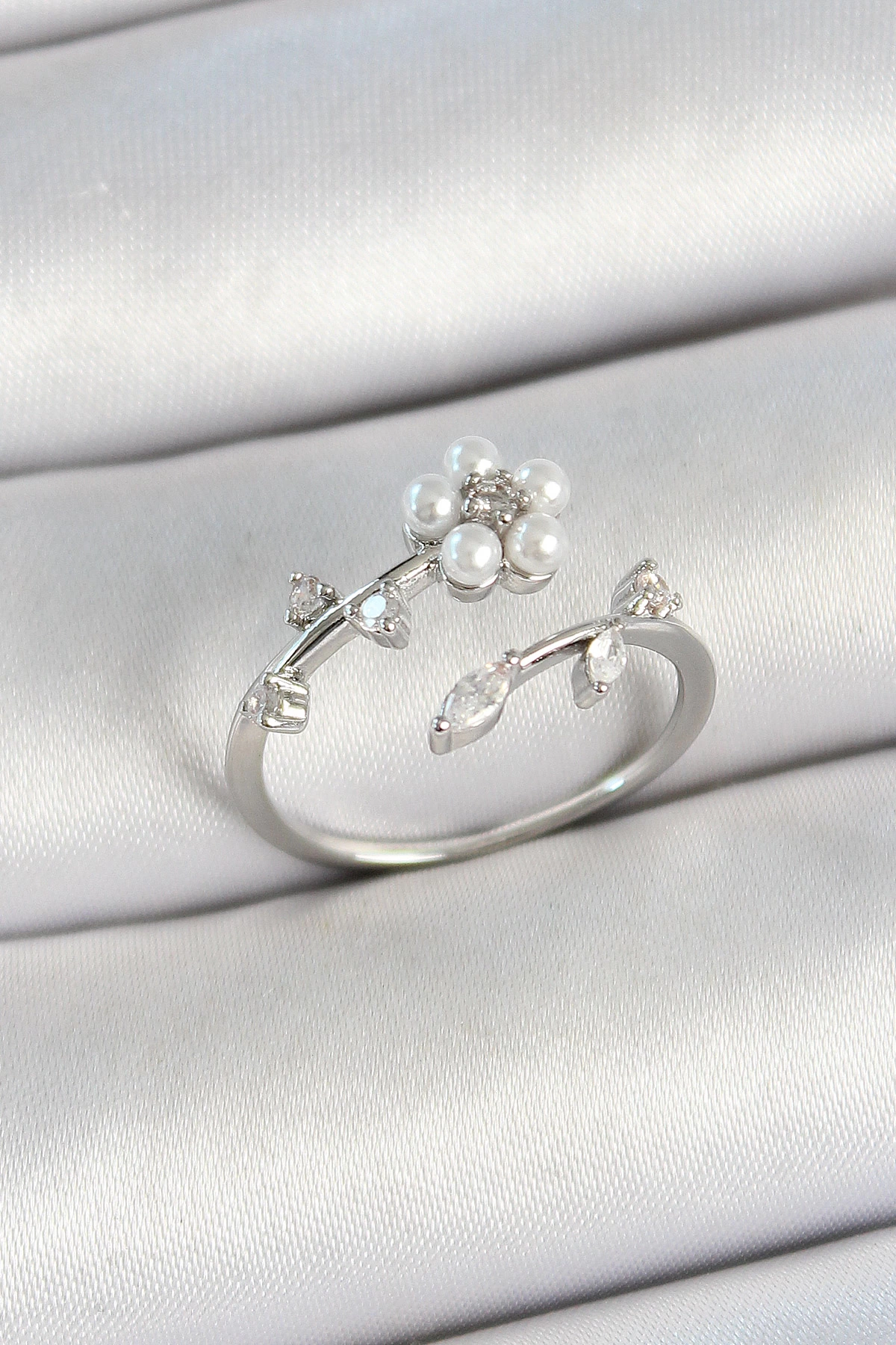 Pirinç İnci Detaylı Papatya Figürlü Zirkon Taşlı Gümüş Renk Ayarlanabilir Kadın Yüzük