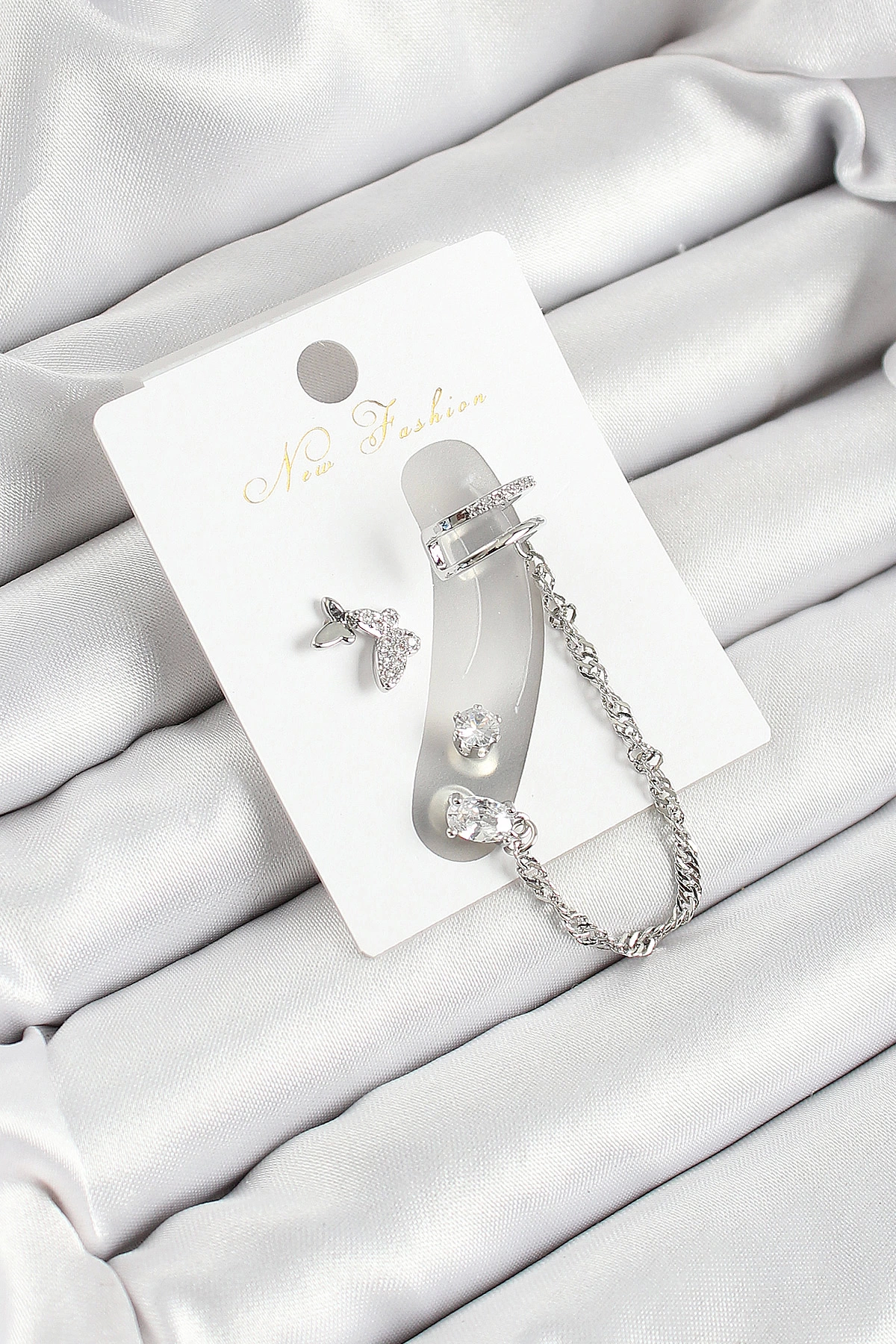 Pirinç Kelebek Figürlü Zirkon Taşlı Gümüş Renk 3'lü Kıkırdak Kadın Küpe Set