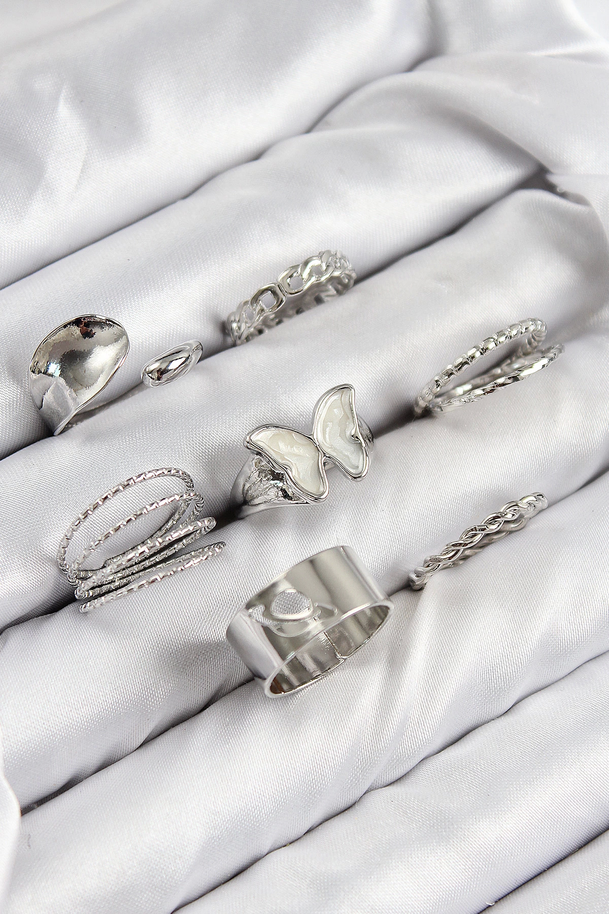 Pirinç Kelebek Model Gümüş Renk Kadın Yüzük Kombin Set