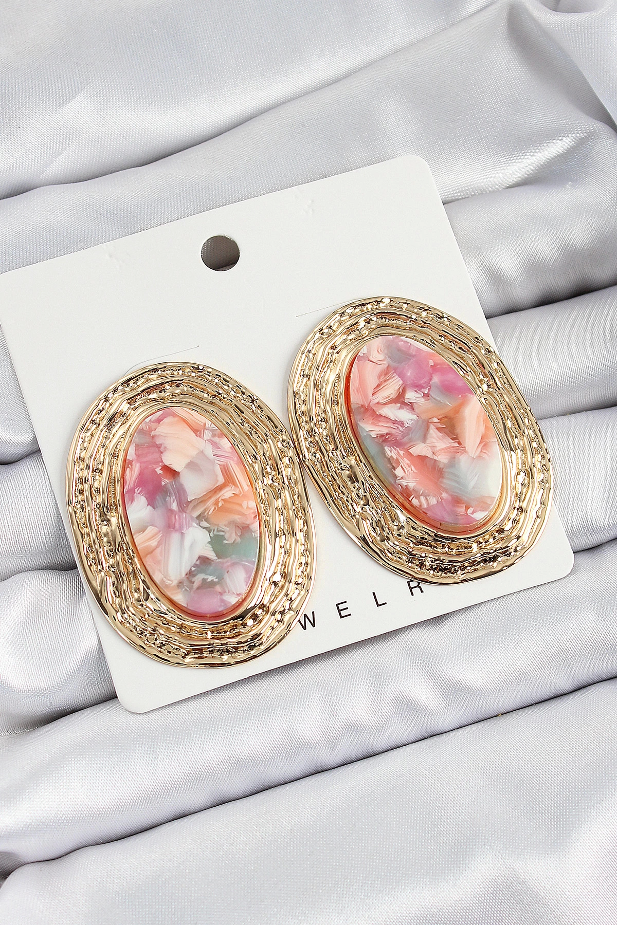 Pirinç Mermer Desenlli Pembe Sedef Oval Vintage Model Gold Renk Kadın Küpe