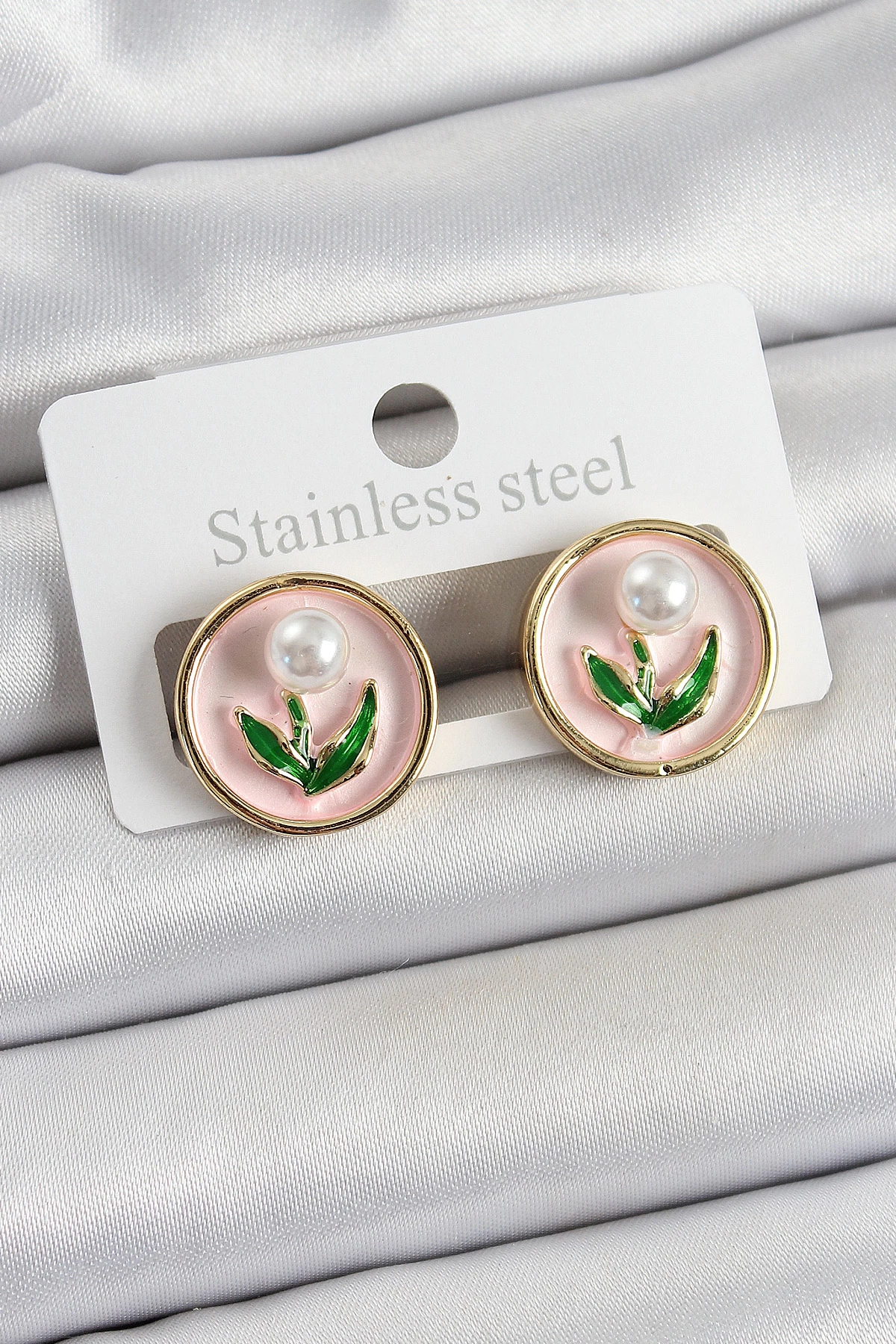 Pirinç Pembe Mineli Lale Figürlü Sanatsal Portre Model Gold Renk Kadın Küpe