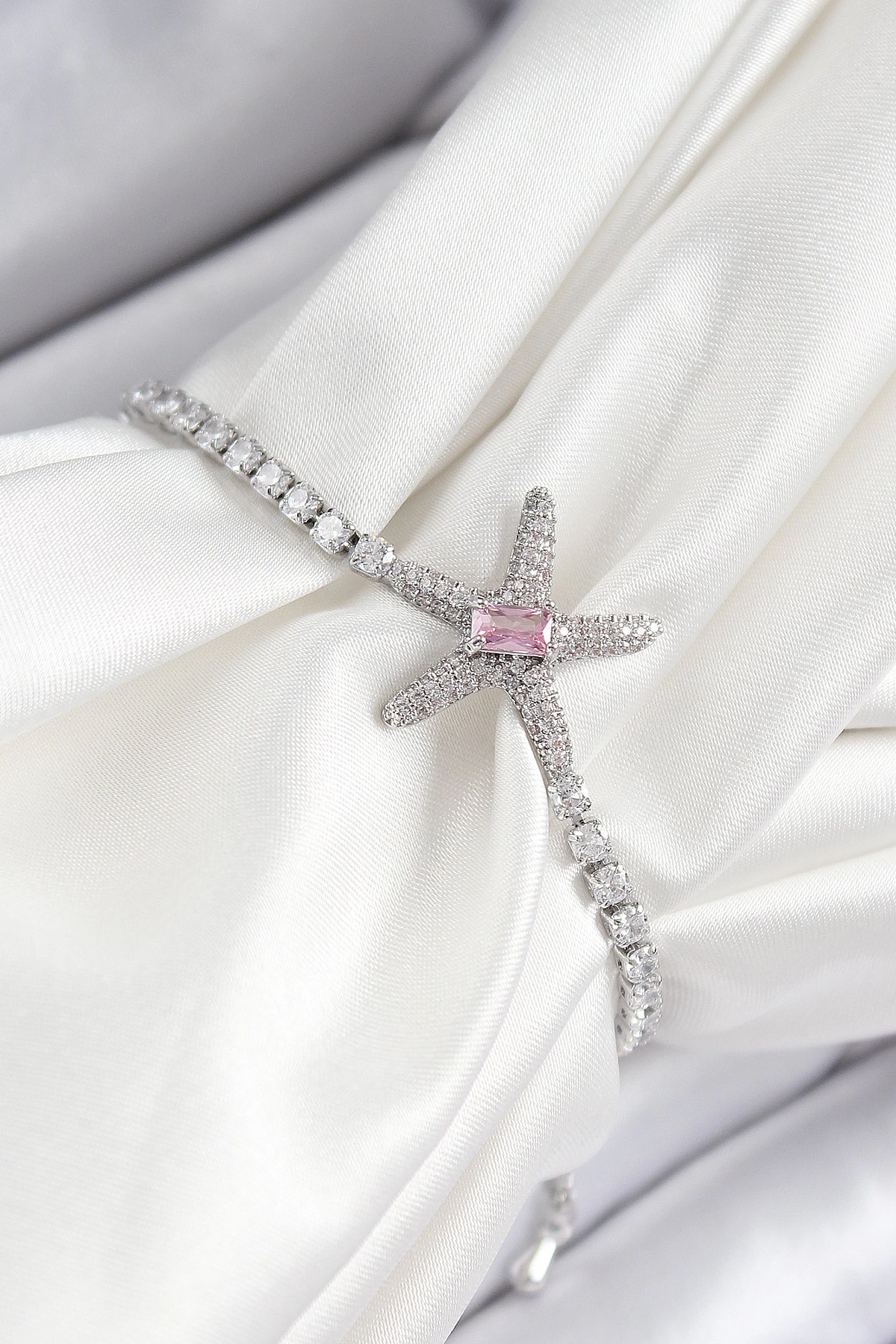Pirinç Pembe Zirkon Taşlı Deniz Yıldızı Model Gümüş Renk Asansörlü Kadın Bileklik