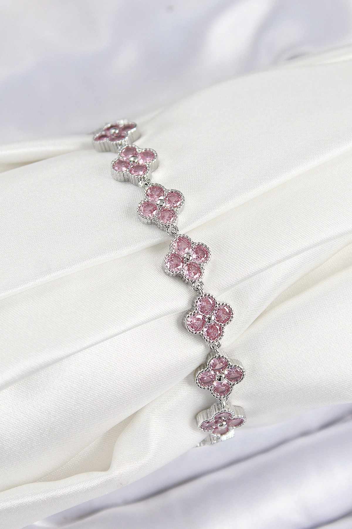 Pirinç Pembe Zirkon Taşlı Yonca Model Gümüş Renk Vıp Seri Kadın Bileklik