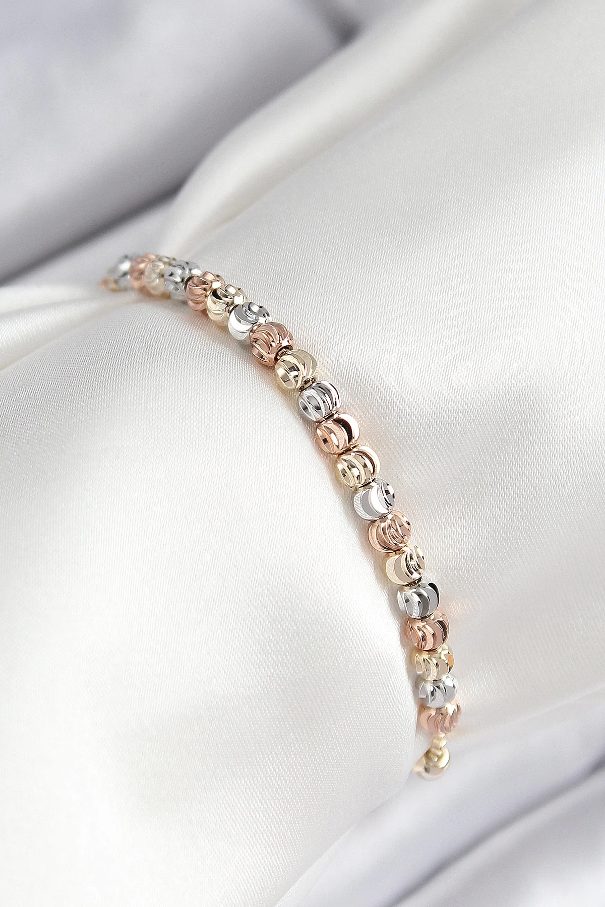Pirinç Sıralı Boncuk Model Gold Gümüş Roz Renk Asansörlü Kadın Bileklik