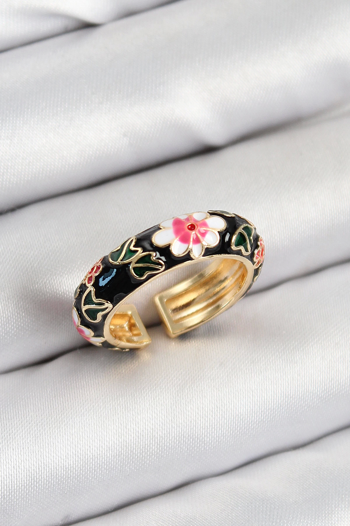 Pirinç Siyah Mineli Çiçek Motifli Gold Renk Ayarlanabilir Kadın Yüzük