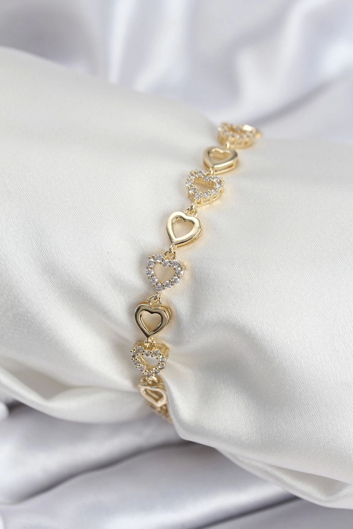Pirinç Vıp Seri Gold Renk Sıralı Kalp Model Kadın Bileklik