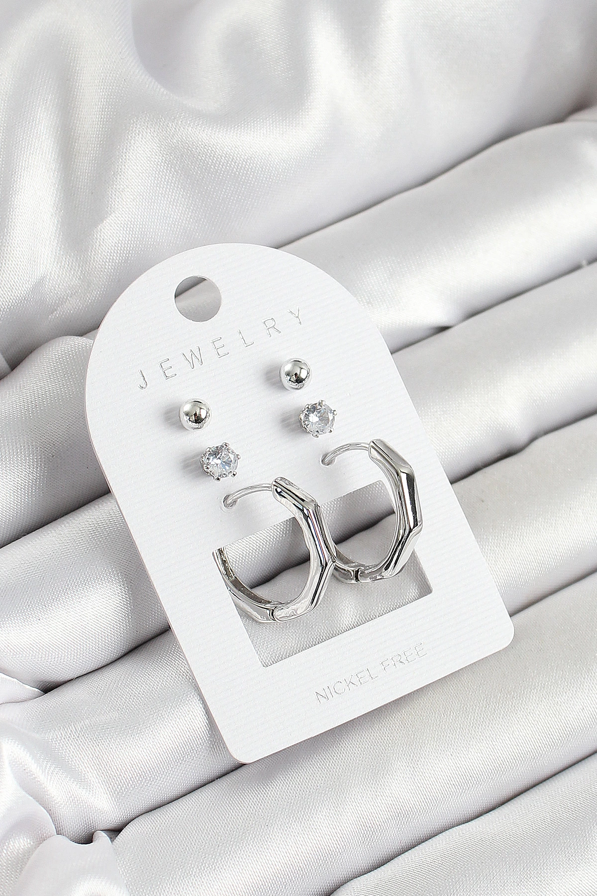 Pirinç Zirkon Taş Ve Kemik Halka Figürlü Gümüş Renk 3'lü Çift Kadın Küpe Set