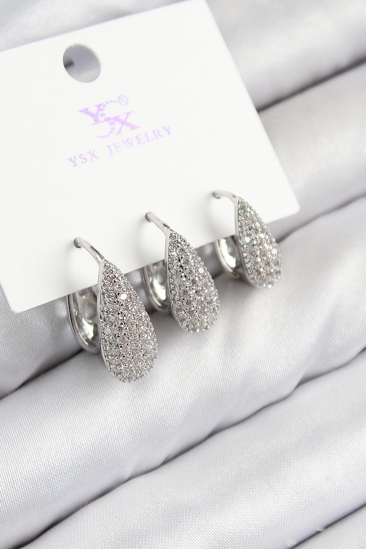 Pirinç Zirkon Taşlı 3'lü Damla Model Gümüş Renk Kadın Küpe