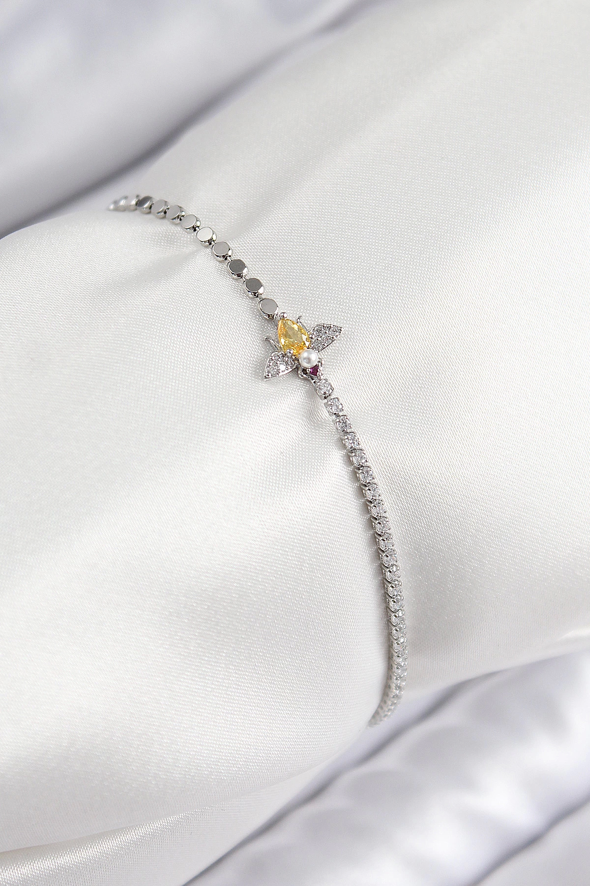 Pirinç Zirkon Taşlı Arı Model Ezme Zincir Gümüş Renk Kadın Bileklik