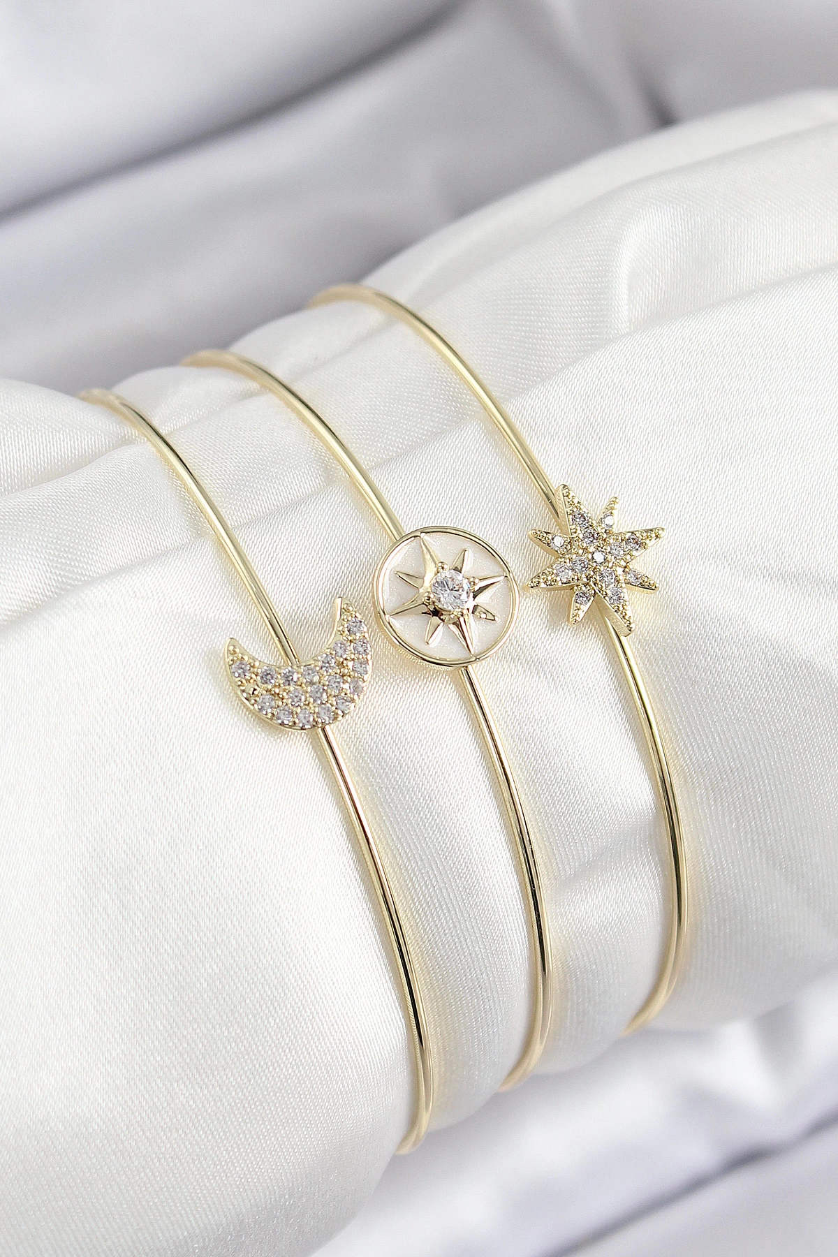 Pirinç Zirkon Taşlı Ay Ve Kutup Yıldızı Model Gold Renk Vip 3'lü Kadın Bileklik