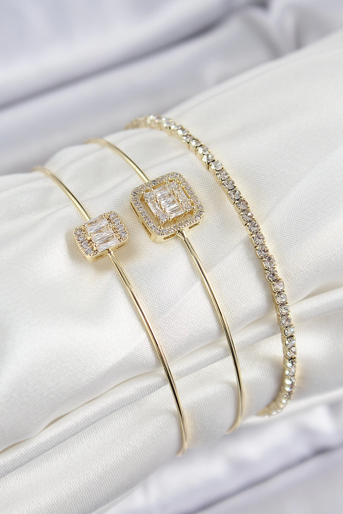 Pirinç Zirkon Taşlı Baget Model Gold Renk Vip 3'lü Kadın Bileklik