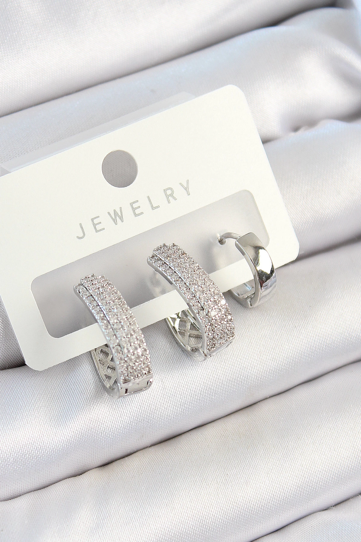 Pirinç Zirkon Taşlı Damla Model Gümüş Renk 3'lü Çift Kadın Küpe Set