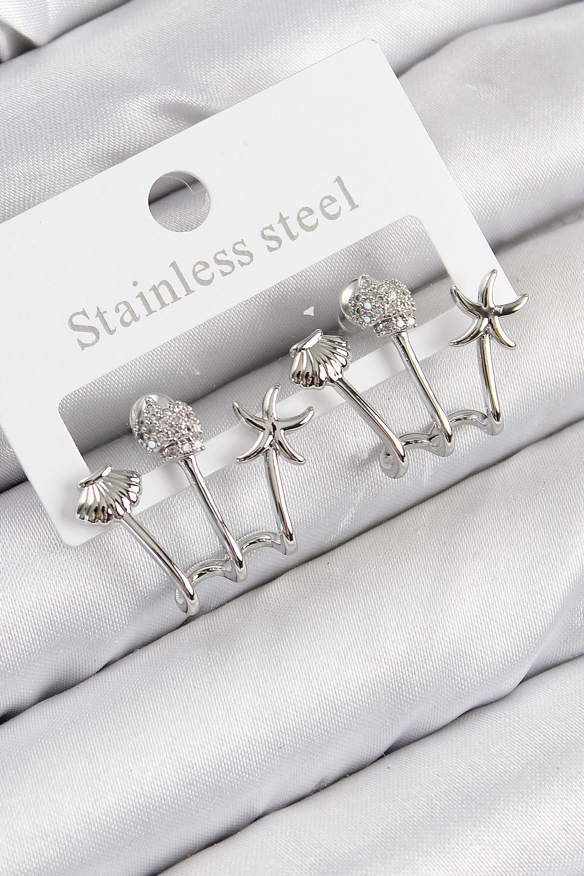 Pirinç Zirkon Taşlı Deniz Yıldızı Ve İstiridye Model Gümüş Renk Kadın Küpe