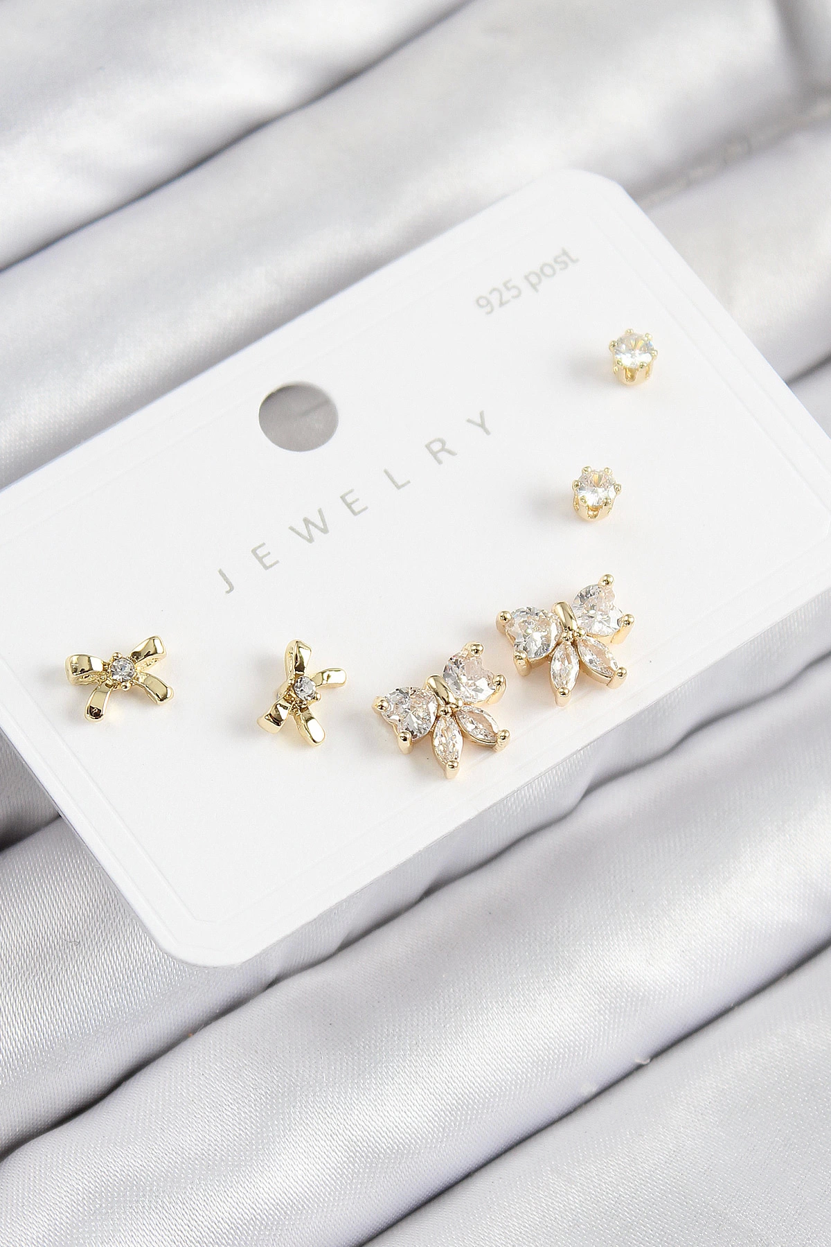 Pirinç Zirkon Taşlı Fiyonk Model Gold Renk 925 Ayar Gümüş Çivi Kadın Küpe Set