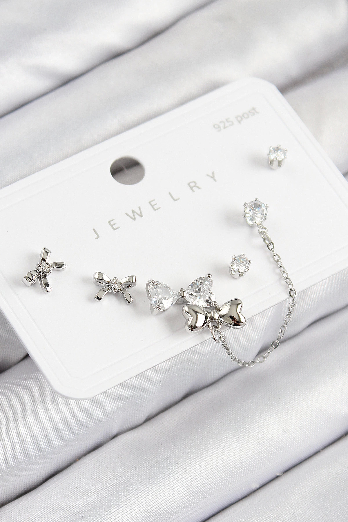 Pirinç Zirkon Taşlı Fiyonk Model Gümüş Renk 925 Ayar Gümüş Çivi Kadın Küpe Set