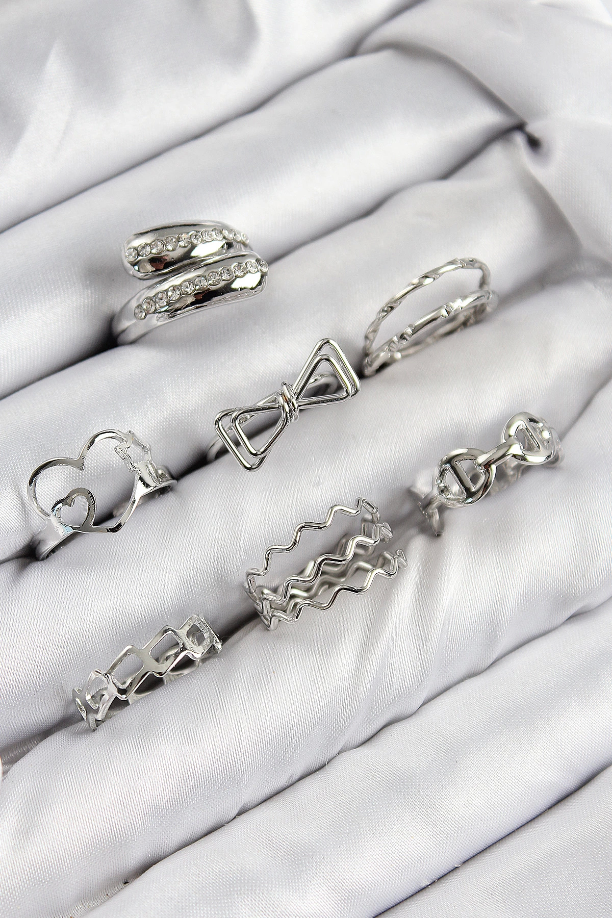 Pirinç Zirkon Taşlı Fiyonk Ve Kalp Model Gümüş Renk Kadın Yüzük Kombin Set