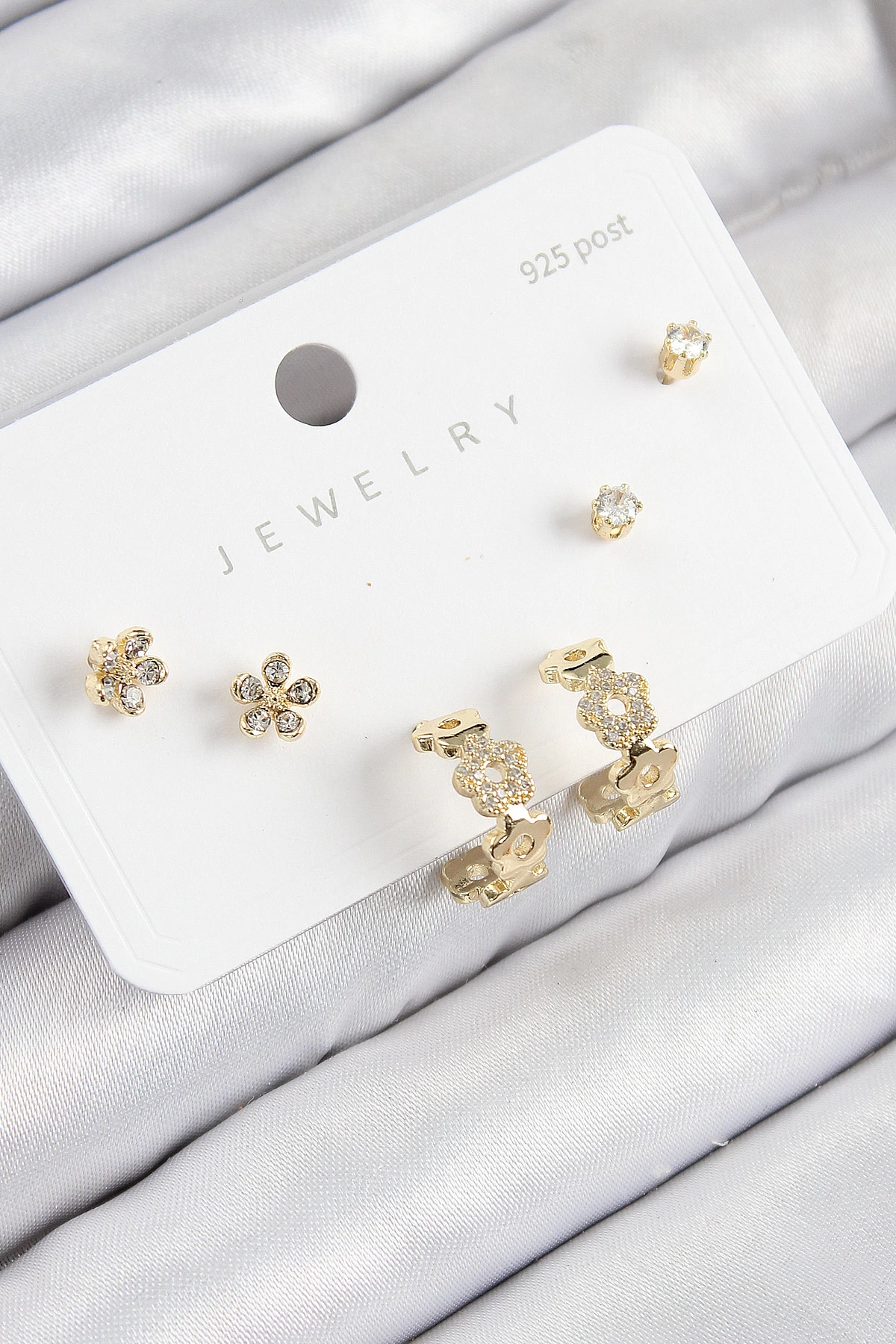 Pirinç Zirkon Taşlı Halka Model Gold Renk 925 Ayar Gümüş Çivi Kadın Küpe Set