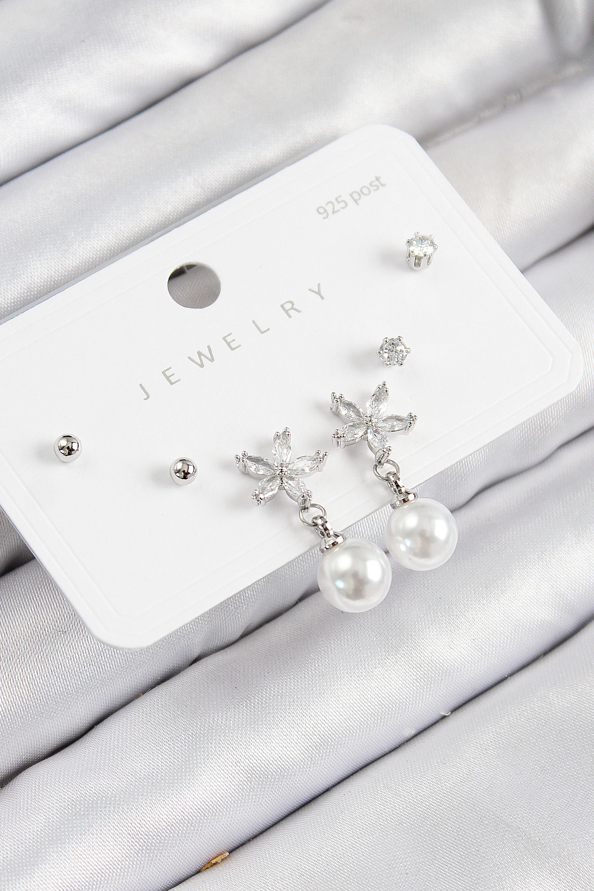 Pirinç Zirkon Taşlı İnci Sallantılı Çiçek Model Gümüş Renk 925 Ayar Gümüş Çivi Kadın Küpe Set