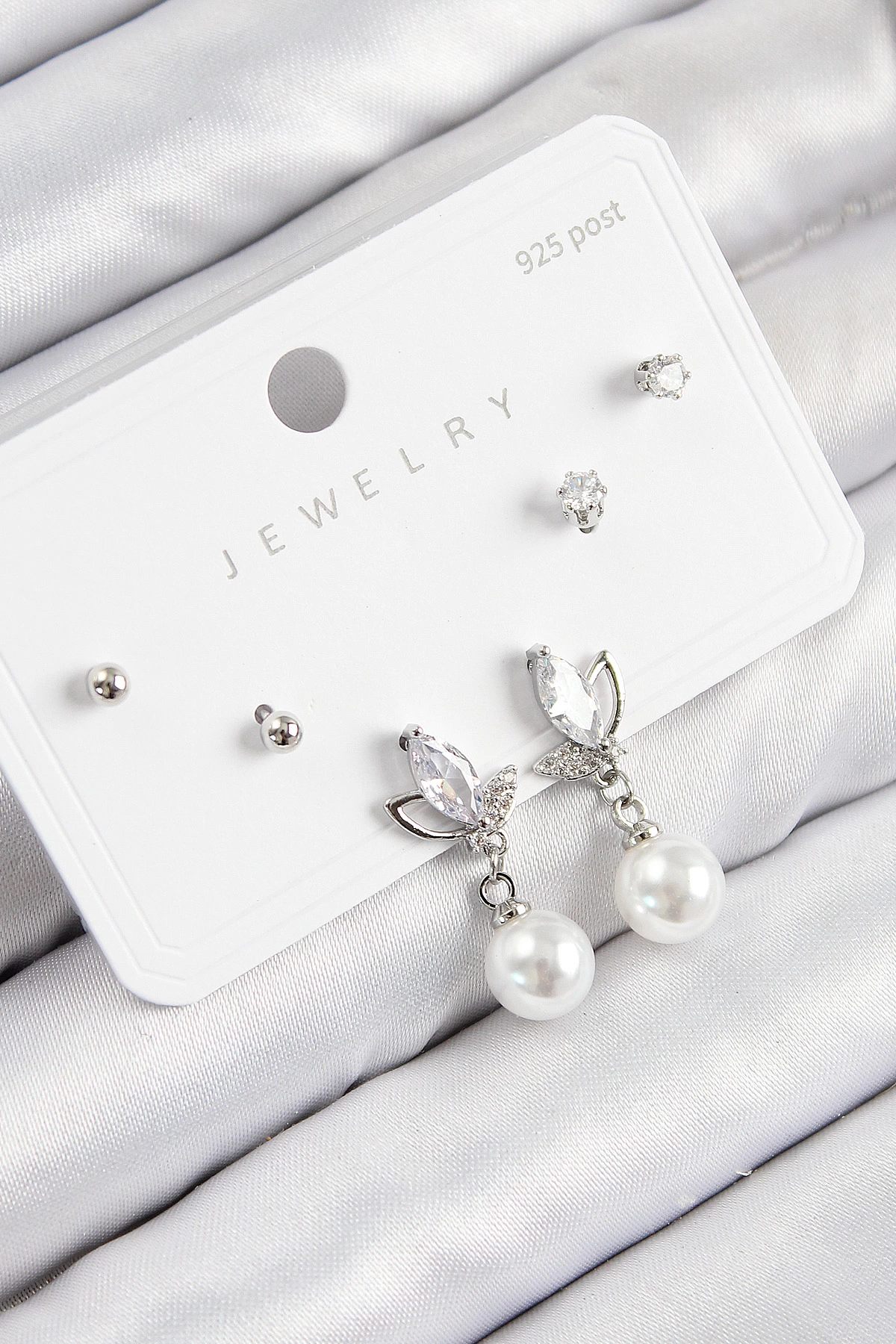 Pirinç Zirkon Taşlı İnci Sallantılı Damla Model Gümüş Renk 925 Ayar Gümüş Çivi Kadın Küpe Set