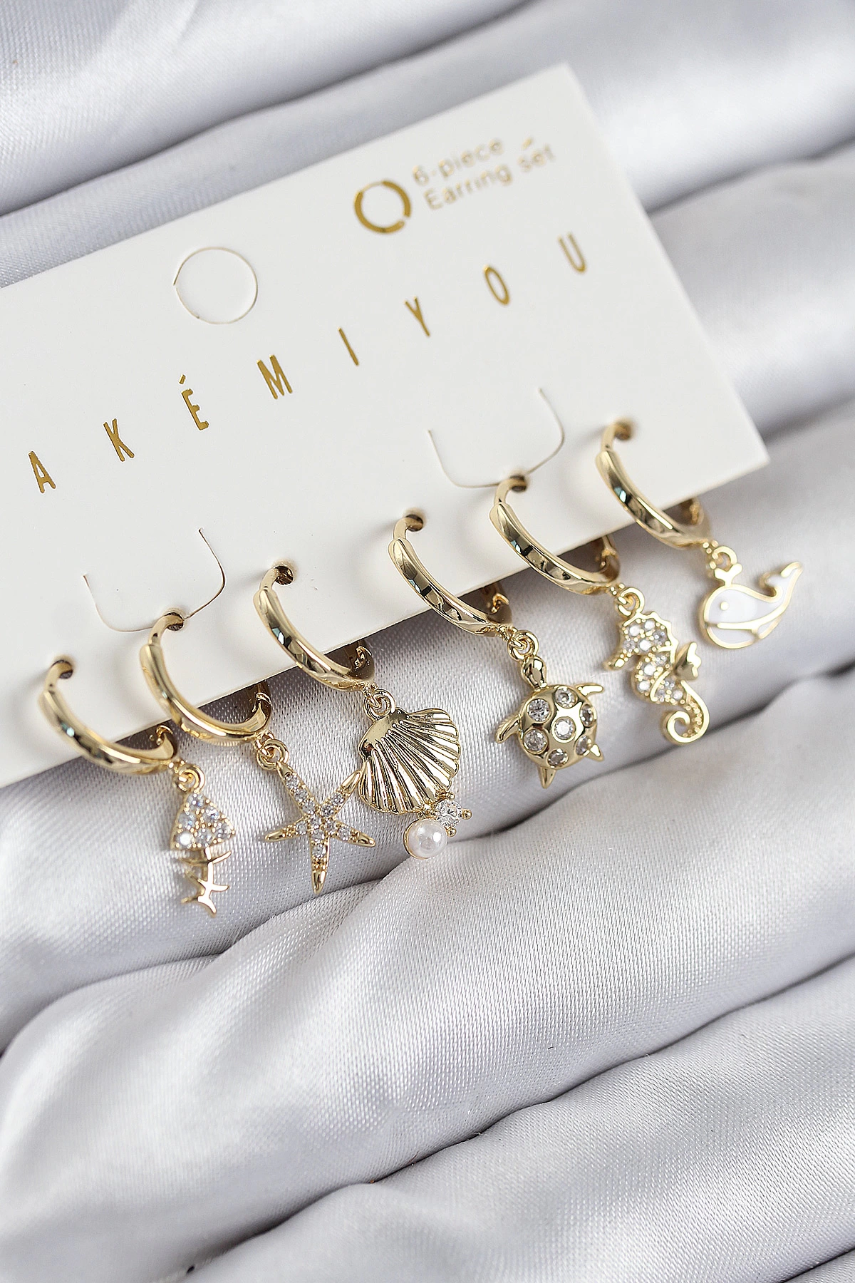Pirinç Zirkon Taşlı İstiridye Balina Ve Yıldız Gold Renk 6'lı Küpe Set