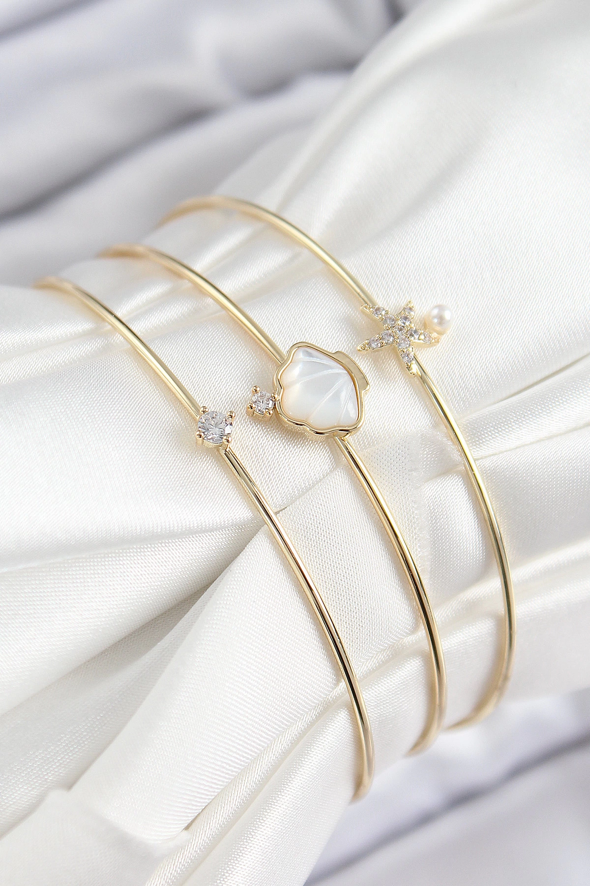 Pirinç Zirkon Taşlı İstiridye Ve Deniz Yıldızı Model Gold Renk Vip 3'lü Kadın Bileklik