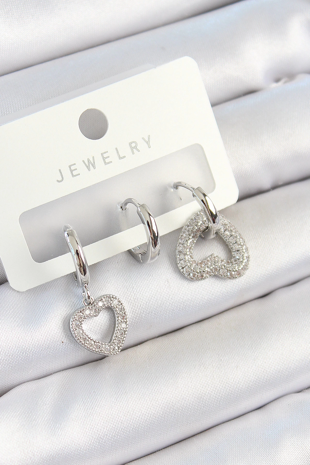 Pirinç Zirkon Taşlı Kalp Model Gümüş Renk 3'lü Çift Kadın Küpe Set