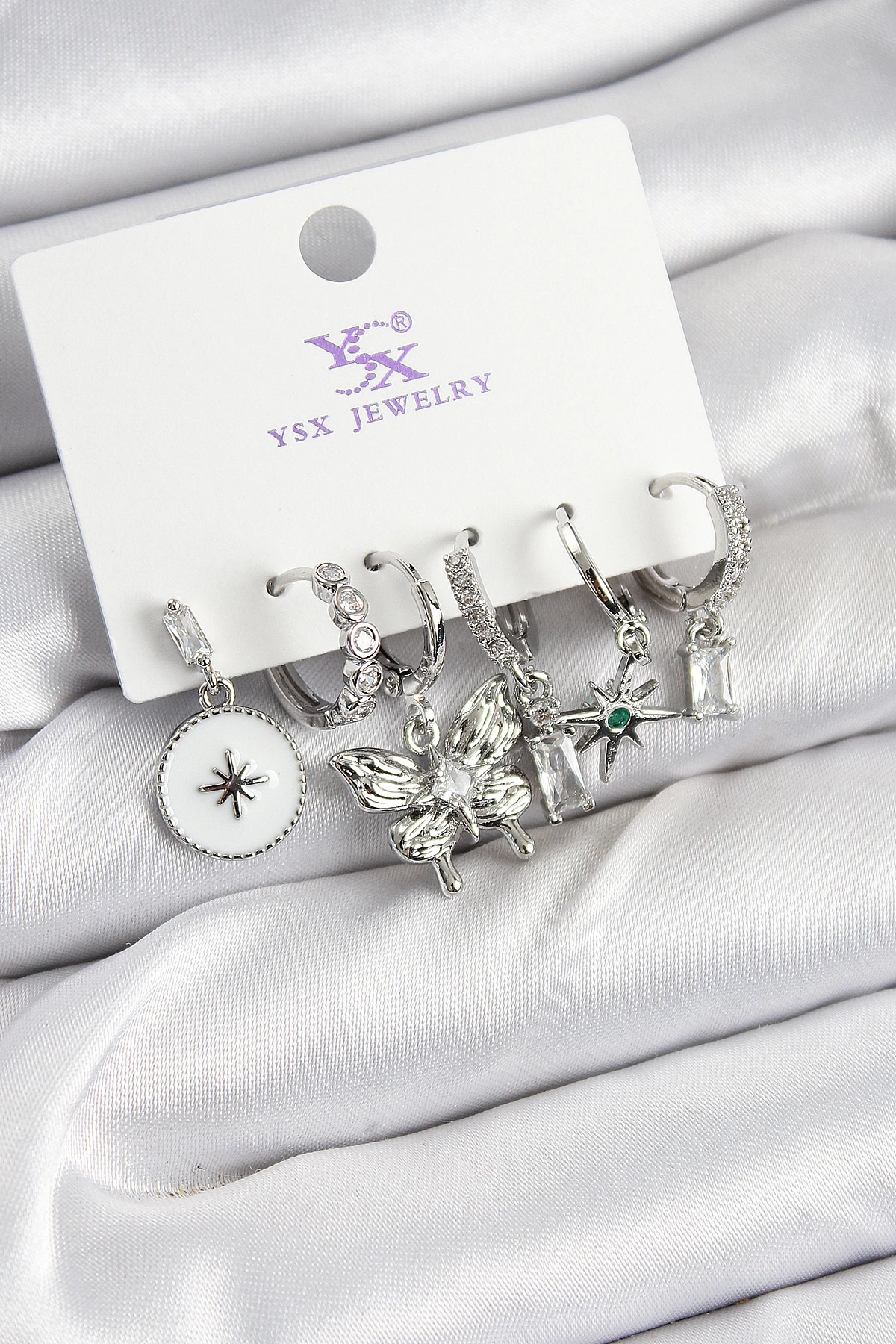 Pirinç Zirkon Taşlı Kelebek Ve Yıldız Model Gümüş Renk 3'lü Çift Kadın Küpe