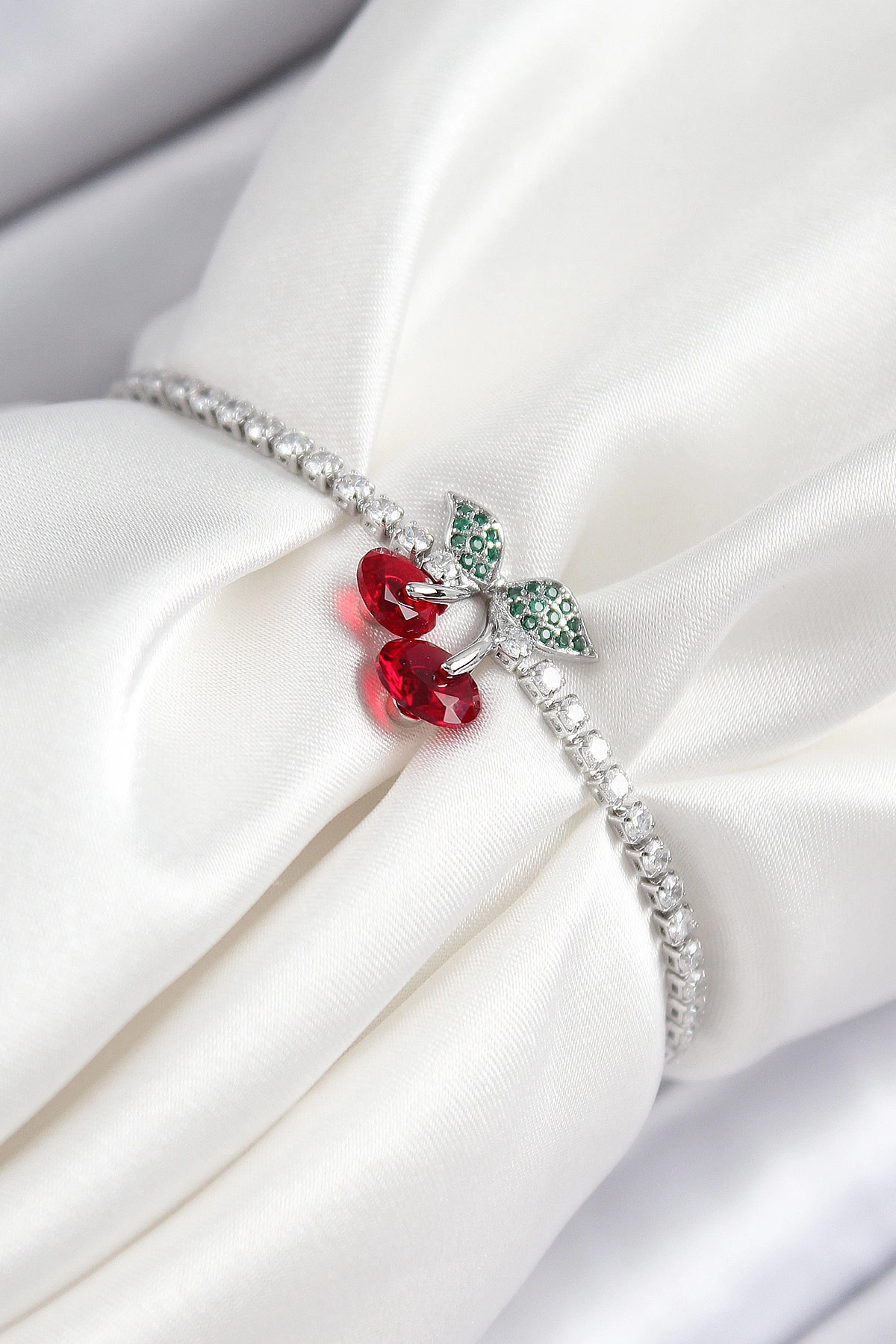 Pirinç Zirkon Taşlı Kiraz Model Gümüş Renk Asansörlü Kadın Bileklik