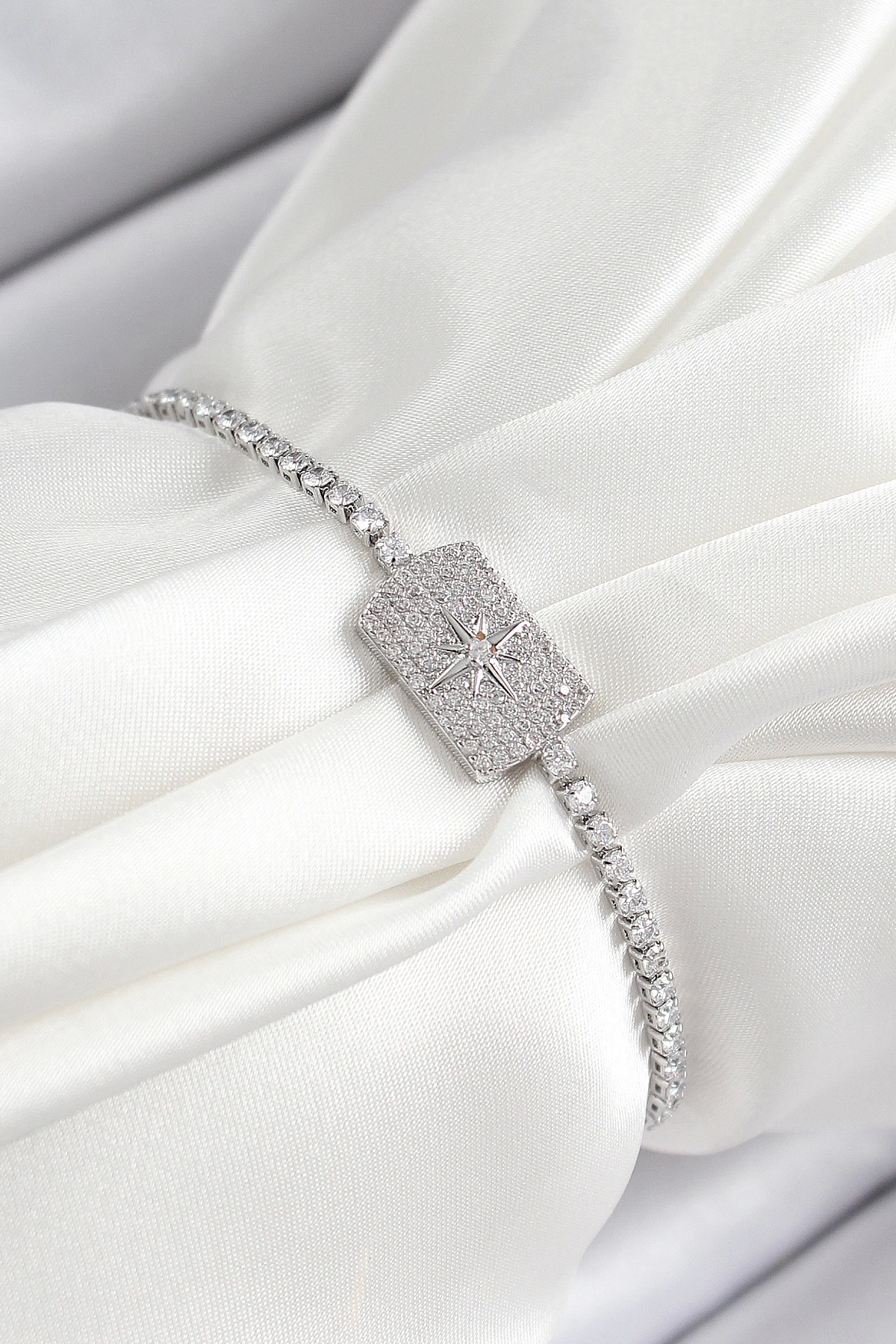 Pirinç Zirkon Taşlı Kutup Yıldızı Model Gümüş Renk Asansörlü Kadın Bileklik