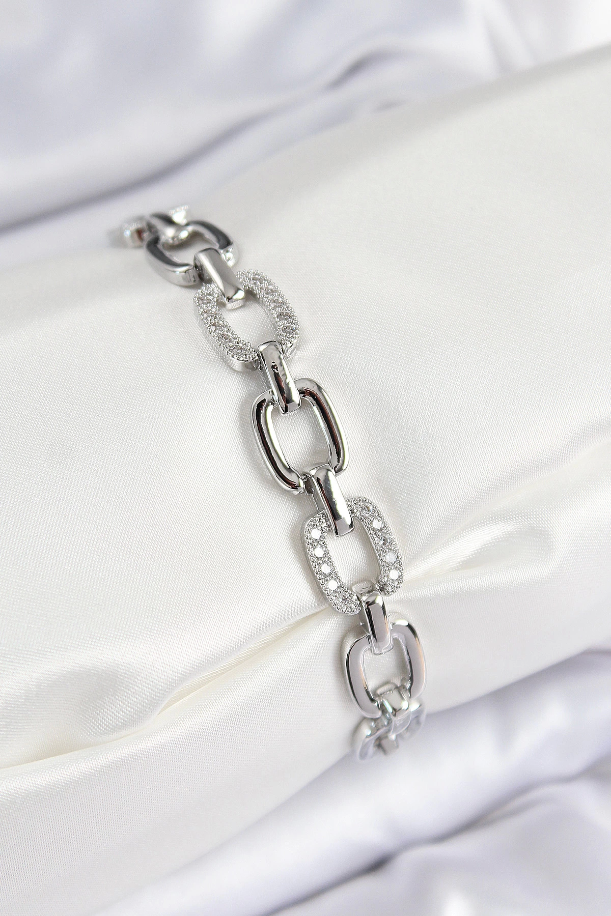 Pirinç Zirkon Taşlı Parçalı Zincir Model Gümüş Renk Kadın Bileklik