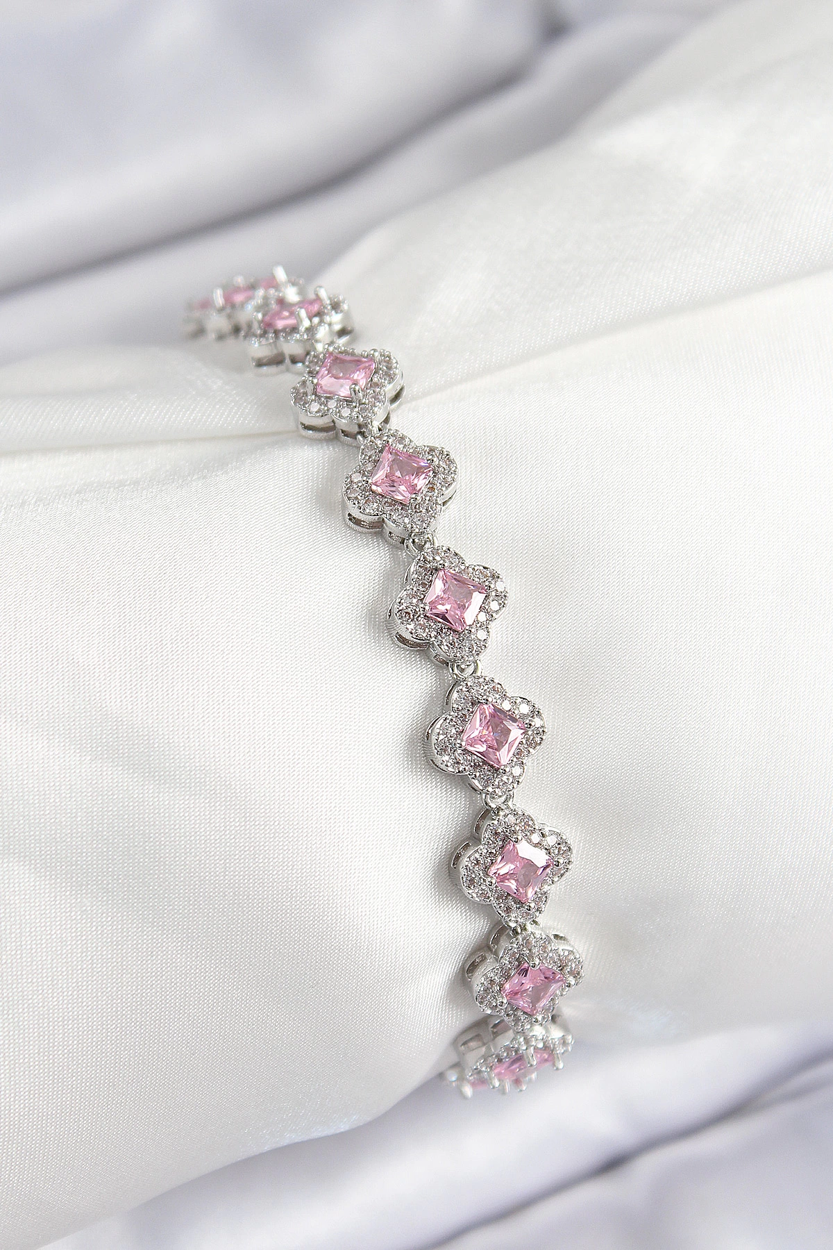 Pirinç Zirkon Taşlı Pembe Yonca Baget Model Gümüş Renk Vıp Seri Kadın Bileklik