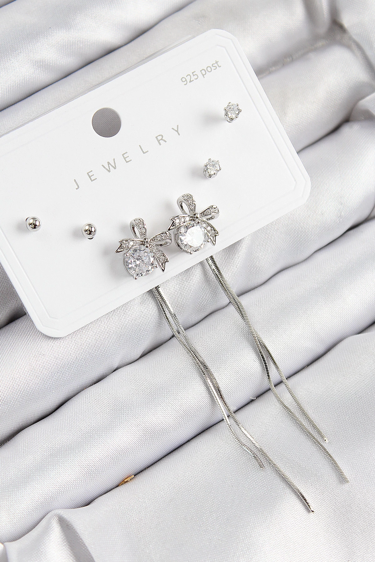 Pirinç Zirkon Taşlı Sallantılı Fiyonk Model Gümüş Renk 925 Ayar Gümüş Çivi Kadın Küpe Set