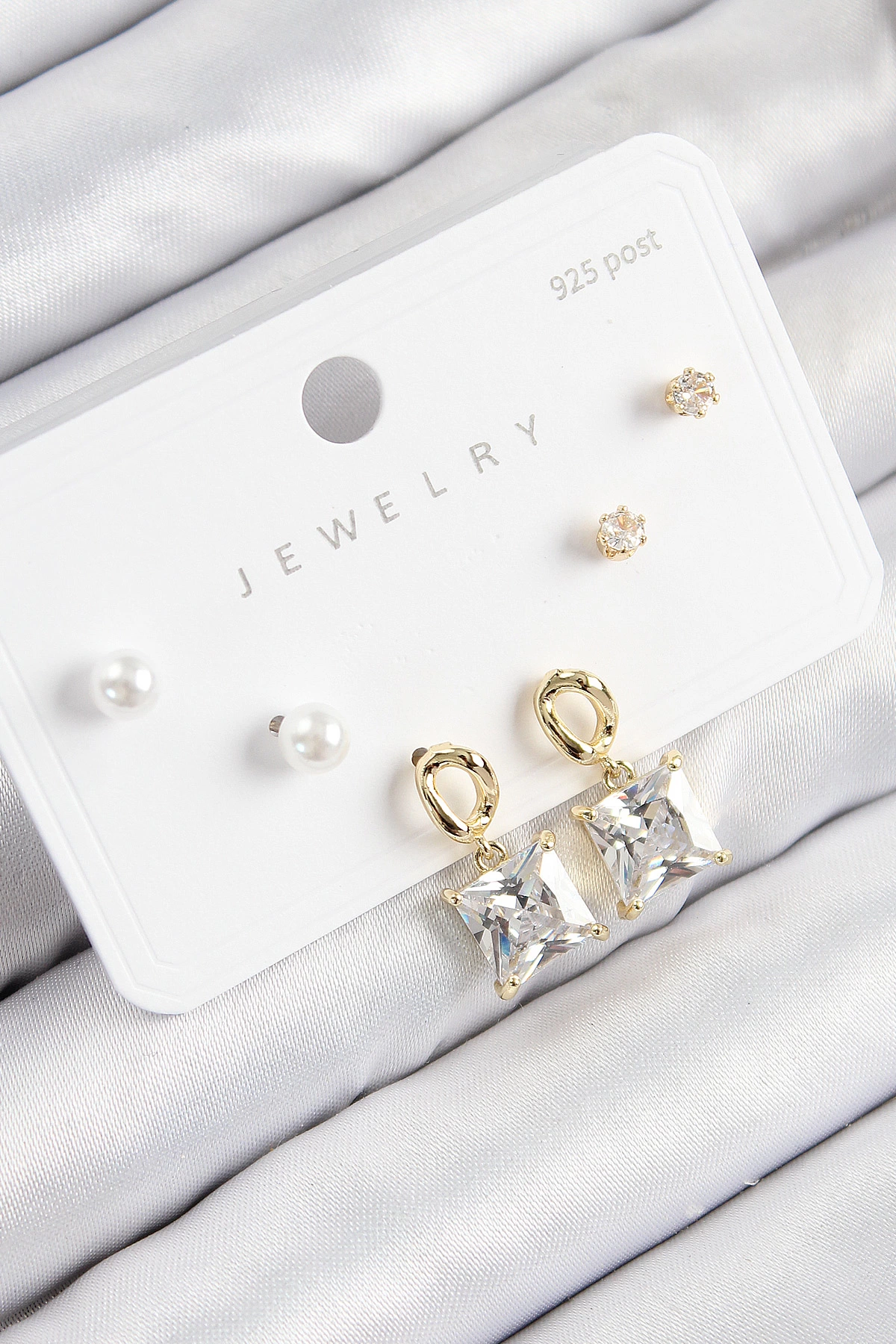 Pirinç Zirkon Taşlı Sallantılı Kare Model Gold Renk 925 Ayar Gümüş Çivi Kadın Küpe Set