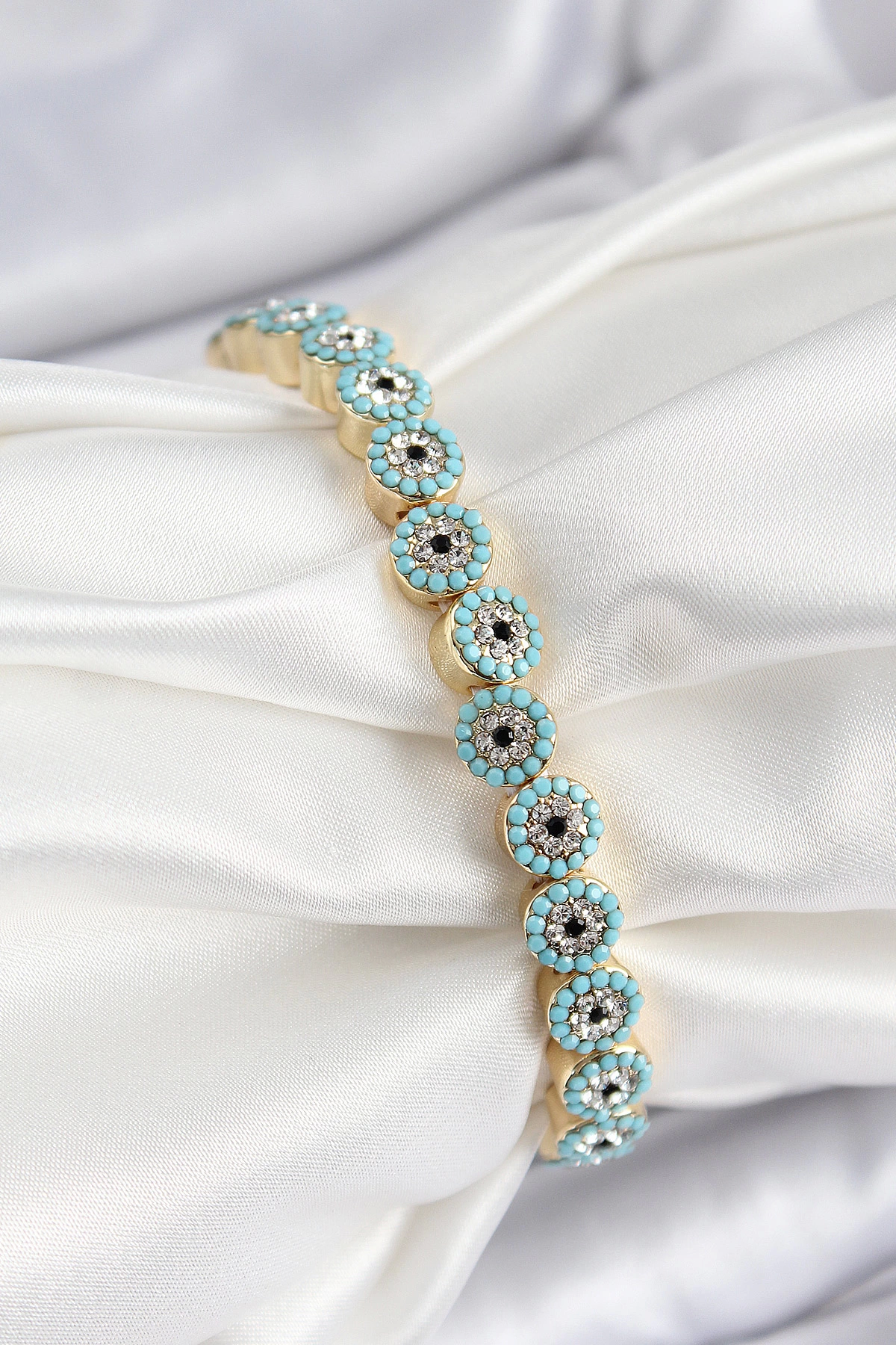 Pirinç Zirkon Taşlı Turkuaz Nazar Model Gold Renk Lastikli Kadın Bileklik