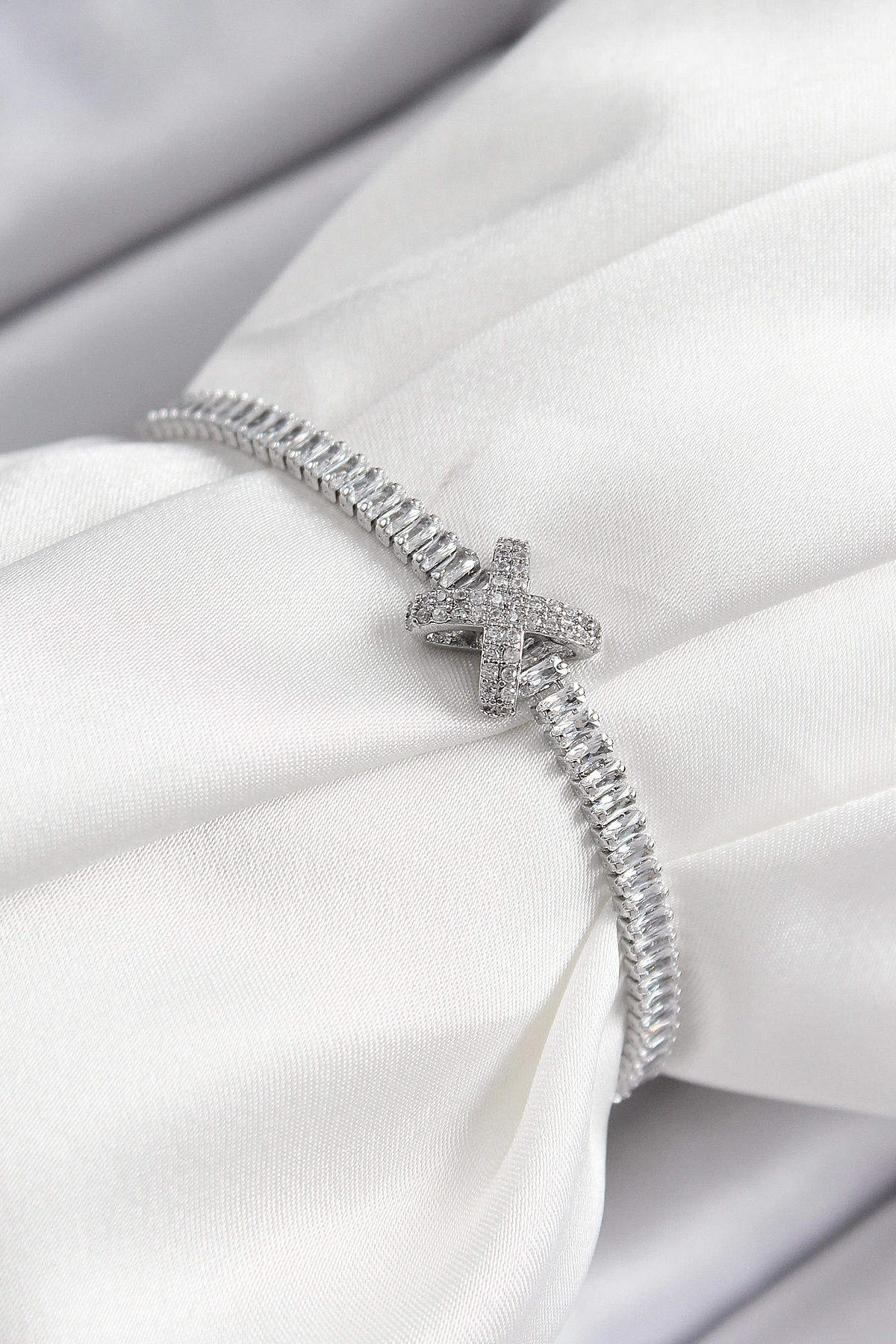 Pirinç Zirkon Taşlı X Detaylı Su Yolu Model Gümüş Renk Asansörlü Kadın Bileklik