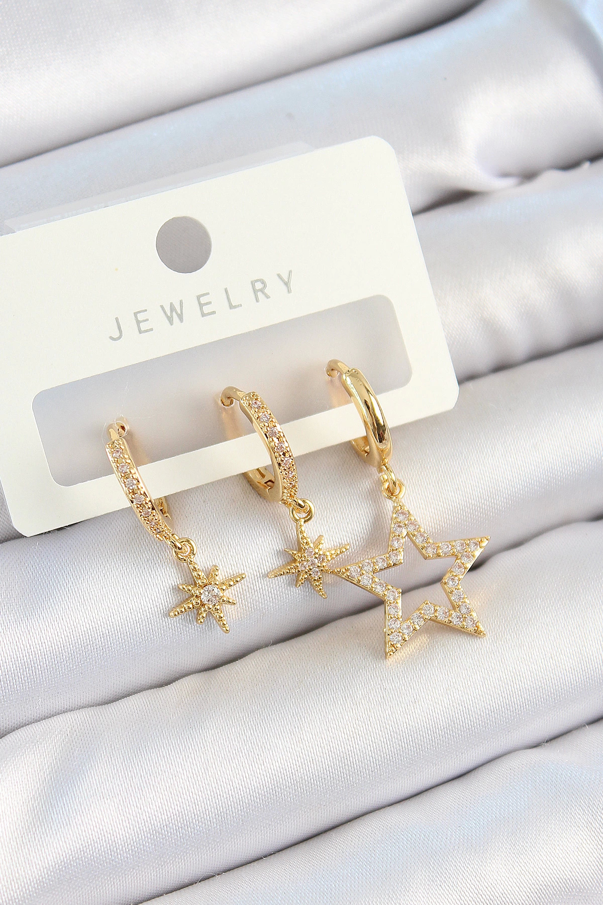 Pirinç Zirkon Taşlı Yıldız Model Gold Renk 3'lü Çift Kadın Küpe Set