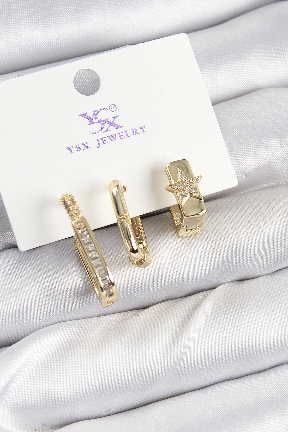 Pirinç Zirkon Taşlı Yıldız Model Gold Renk 3'lü Kadın Küpe