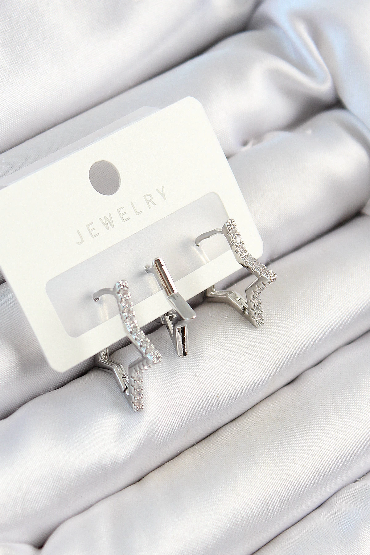 Pirinç Zirkon Taşlı Yıldız Model Gümüş Renk 3'lü Çift Kadın Küpe Set