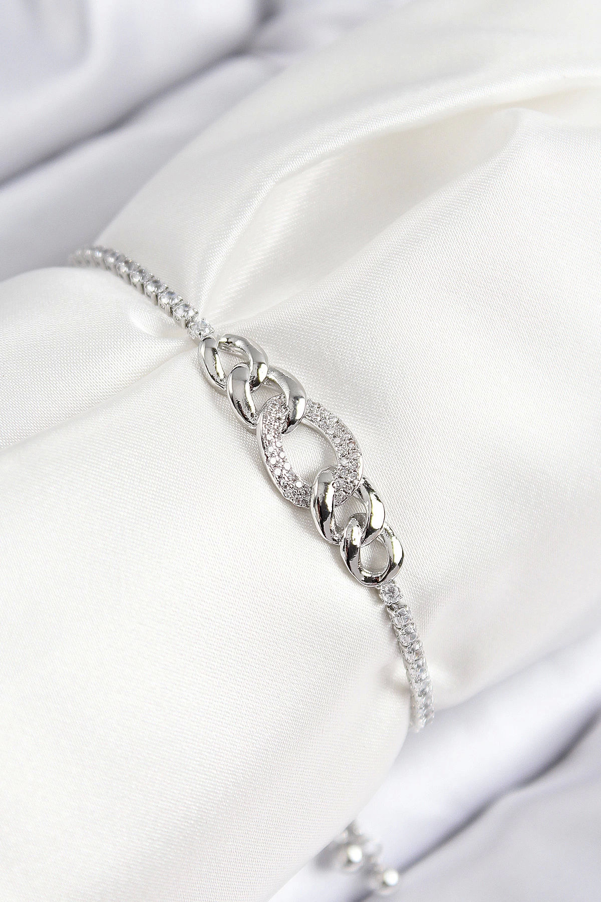 Pirinç Zirkon Taşlı Zincir Model Gümüş Renk Asansörlü Kadın Bileklik