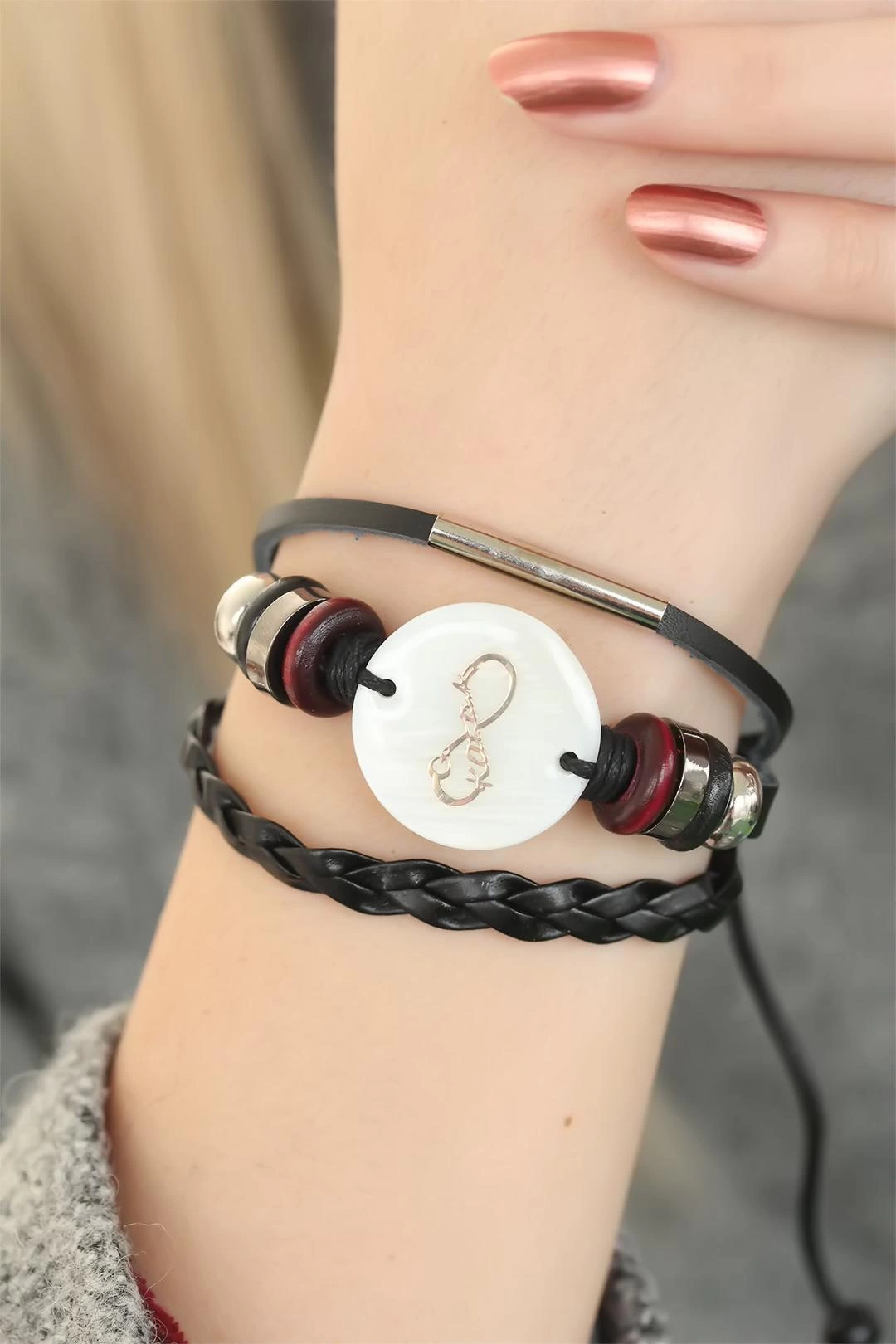 Siyah Renk Sonsuzluk Ve Atatürk İmza Tasarım Çoklu Deri Bayan Bileklik