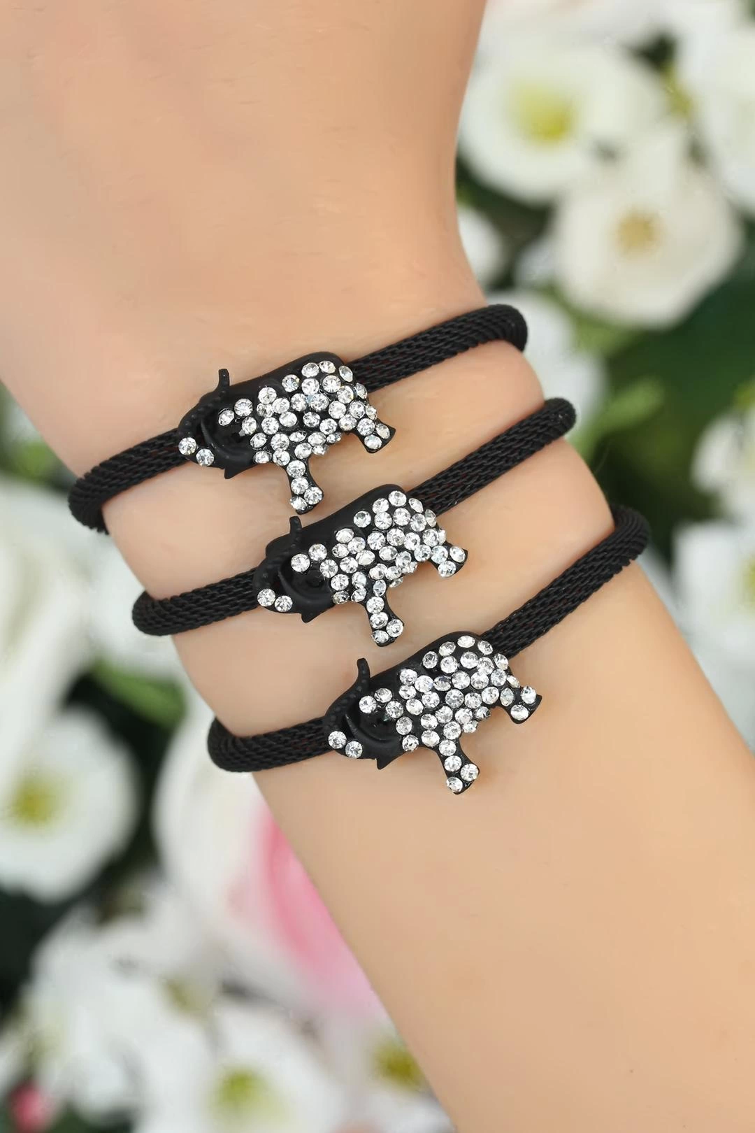 Siyah  Zirkon Taşlı Fil Aksesuarlı Metal Bayan Bileklik