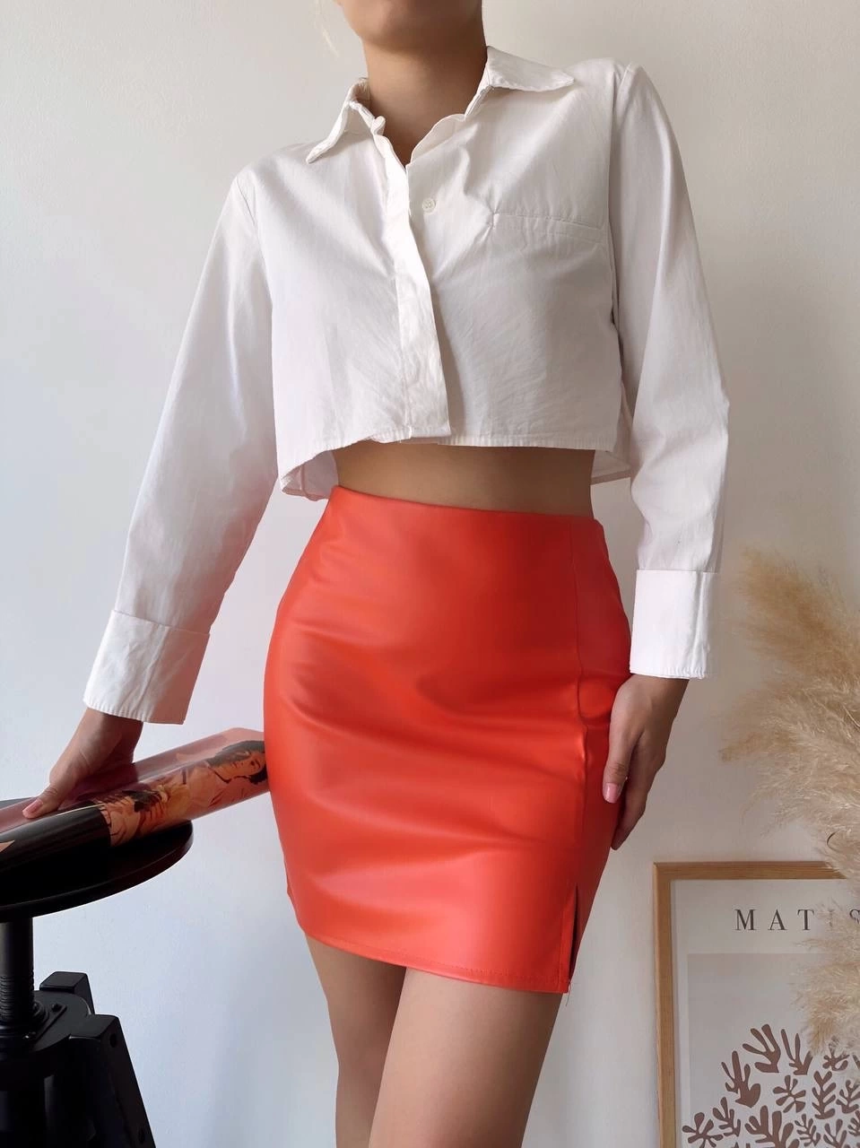 Tek Yırtmaçlı Arkadan Fermuarlı Deri Etek Turuncu S24475