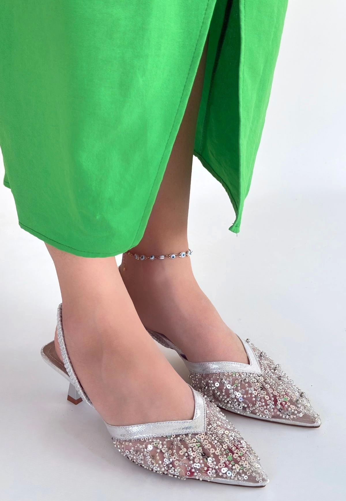 Toyi Gümüş Saten Topuklu Ayakkabı