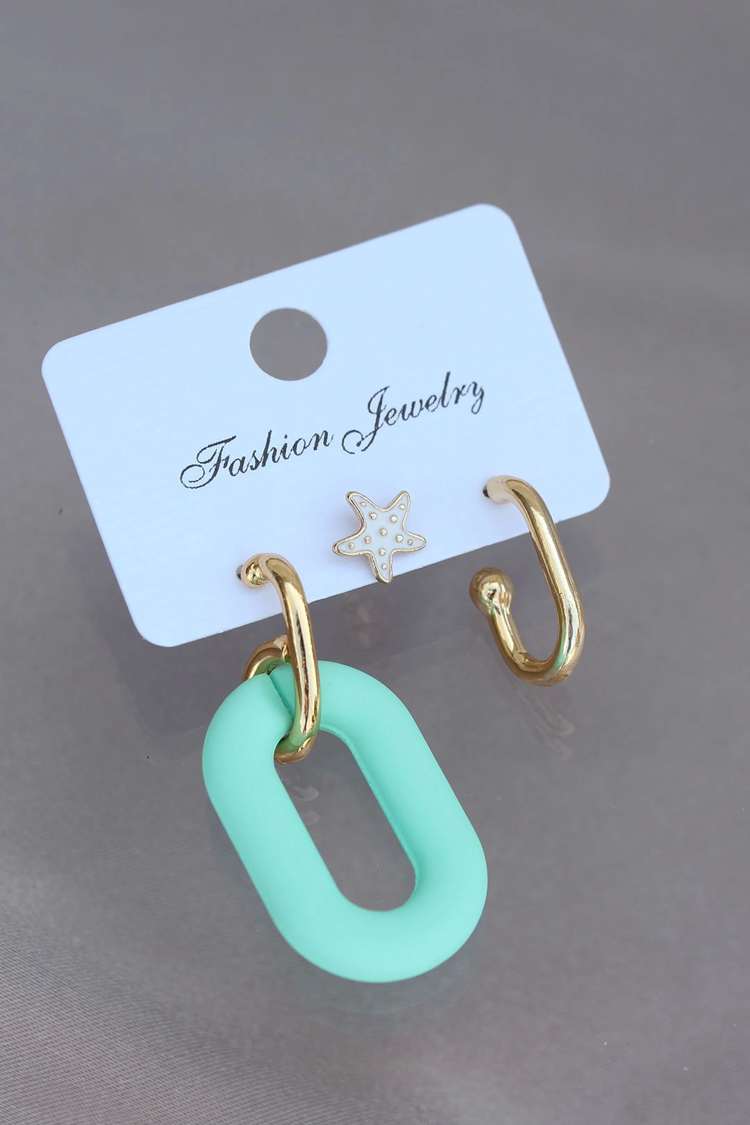 Trend Su Yeşili Renk Deniz Yıldızı Figürlü Küpe Seti