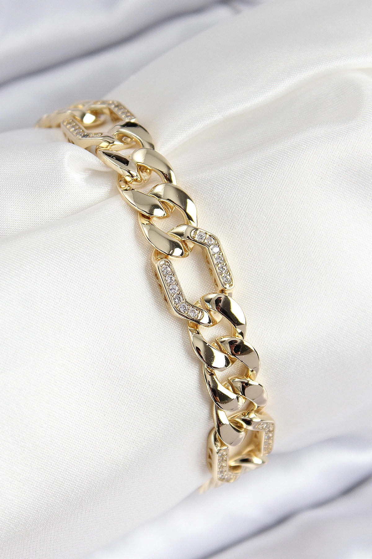 Vıp Pirinç Zirkon Taşlı Parçalı Zincir Model Gold Renk Kadın Bileklik