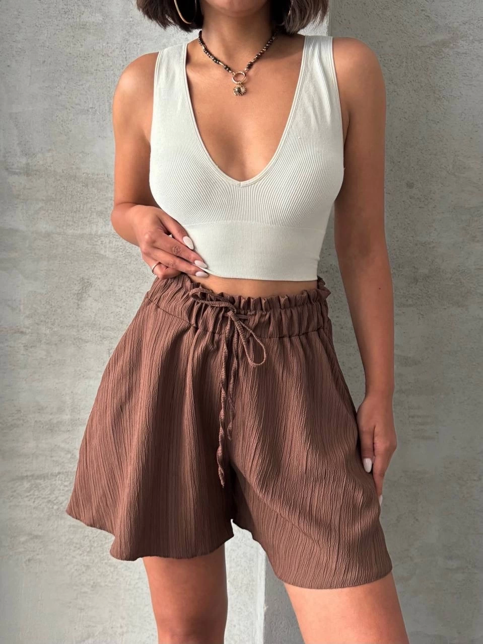 Volanlı Keten Şort Kahve S255058