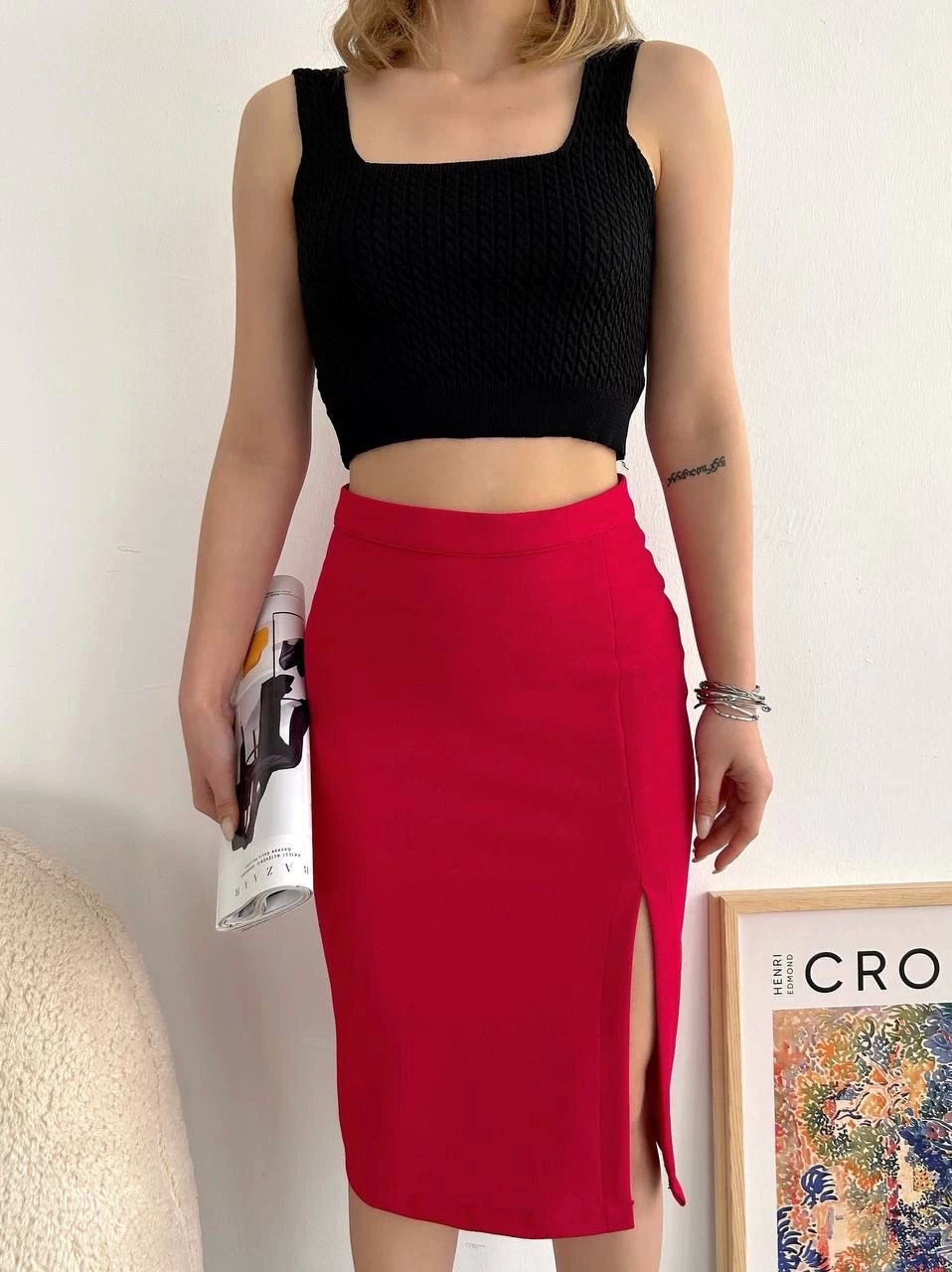 Yırtmaçlı Esnek Kumaş Midi Boy Etek Koyu Kırmızı